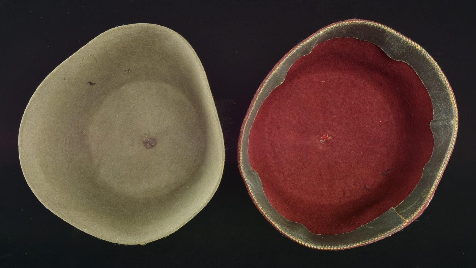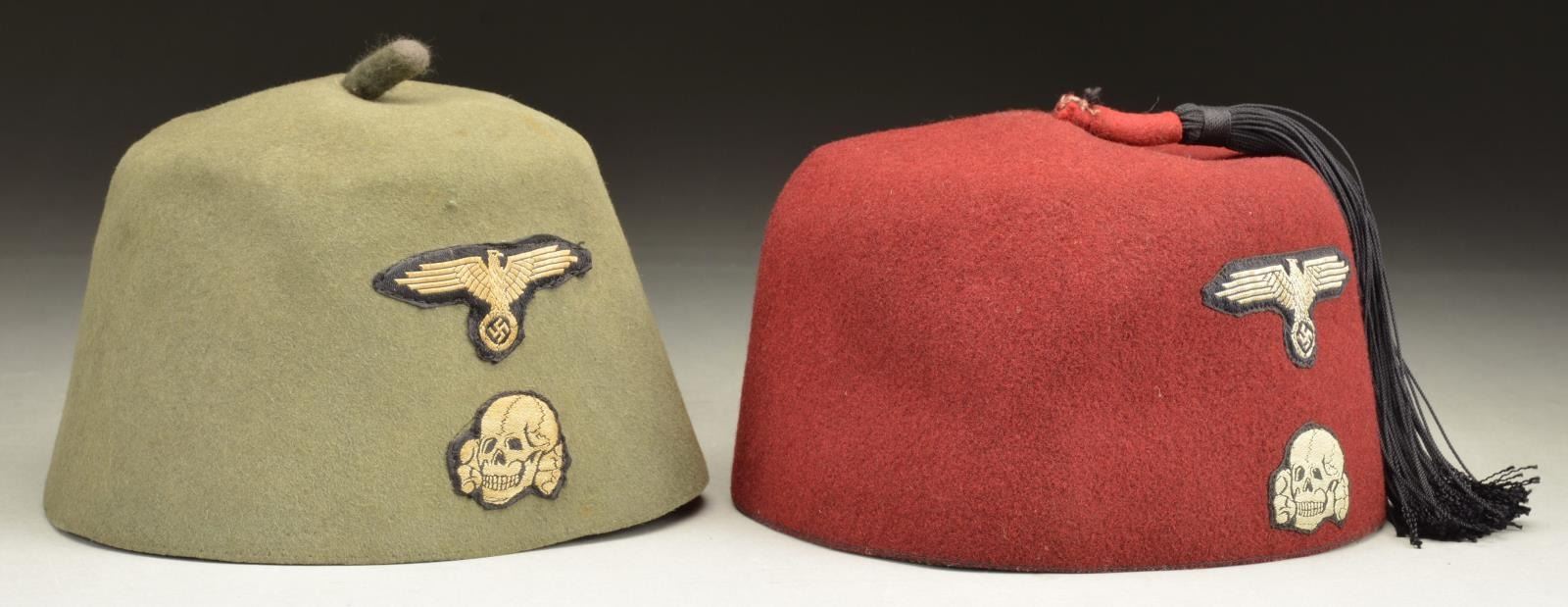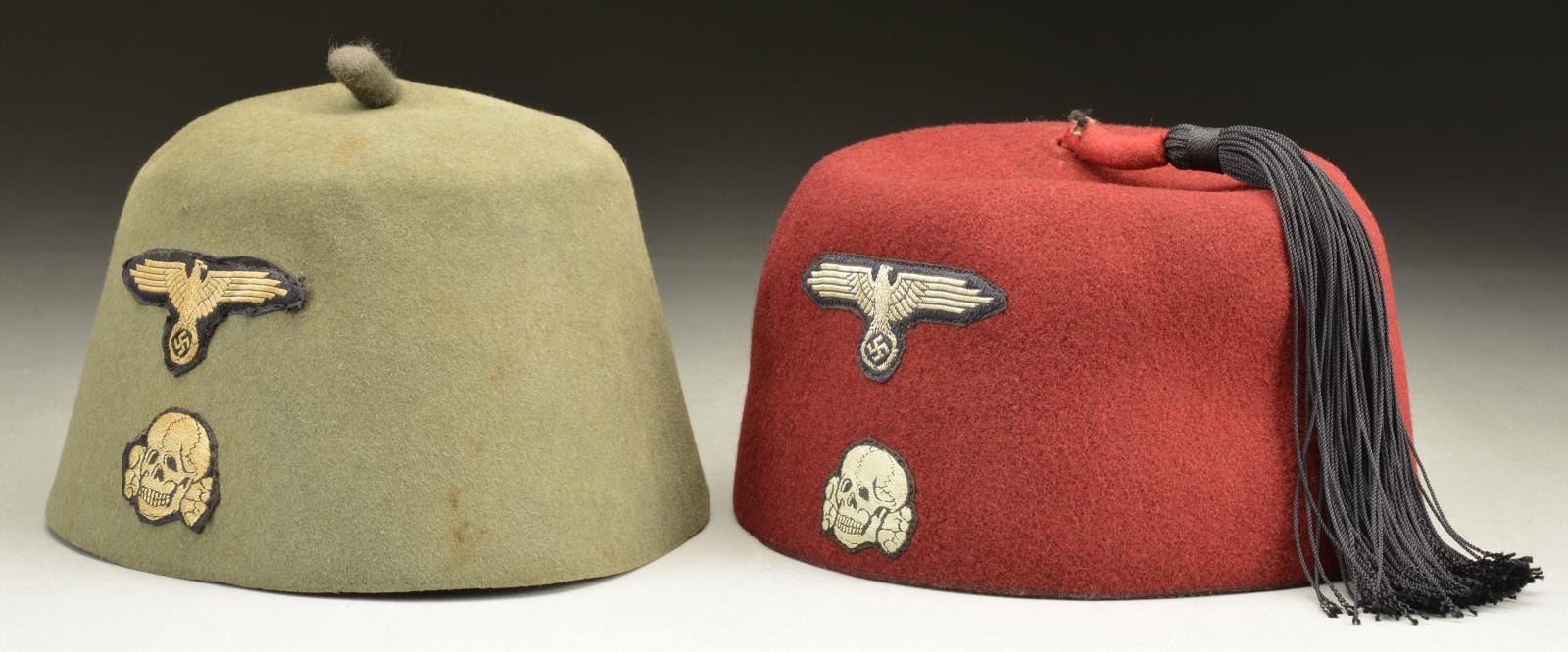 2) DRESS FEZ. This fez is made of a red/maroon felt and was intended to be worn with the SS dress uniform. It features a small 1" rolled piece of felt at the crown with a black tassel attached. The front features a black and white bevo Death's Head skull with SS eagle above. The interior has the correct original 1 1/8", gray green sweatband and the correct interior white size tag with no stamp. CONDITION: the body of the fez is solid with no visible moth damage. Insignia are bold and show only light wear. (02-17093-3/BF). $1,800-2,200.