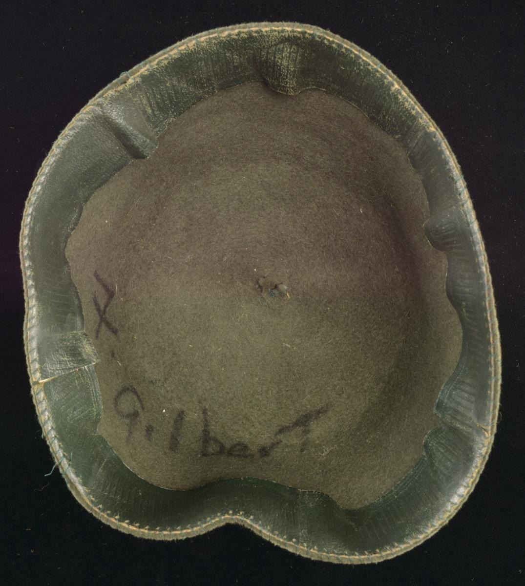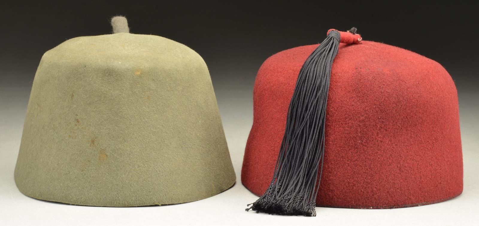 1) COMBAT FEZ. This fez is made of green/gray felt and was intended to be worn with the gray combat uniform. It features a small 1" rolled piece of felt at the crown that originally had a dark green tassel attached, which is now missing. The front features a black and white bevo Death's Head skull with SS eagle above. The interior is missing its sweatband. CONDITION: the body of the fez is solid with virtually no moth damage. Insignia are bold and show light wear with minor staining.