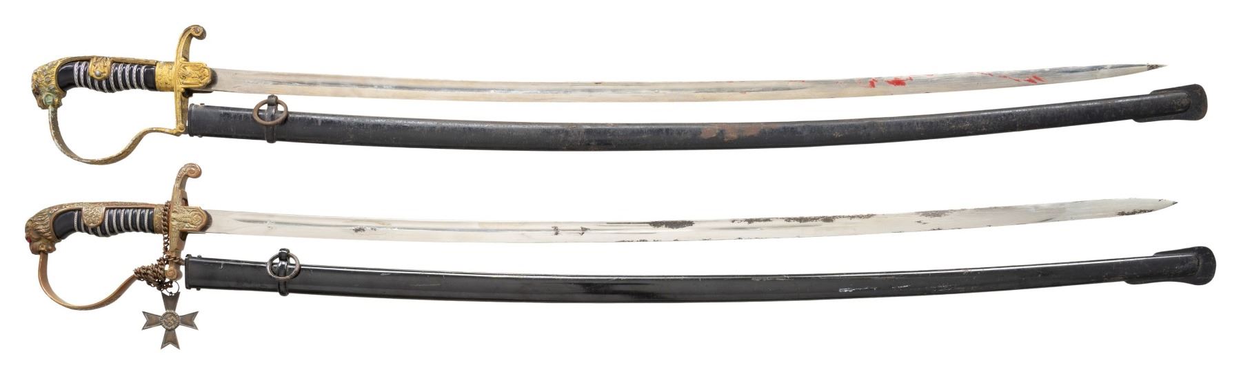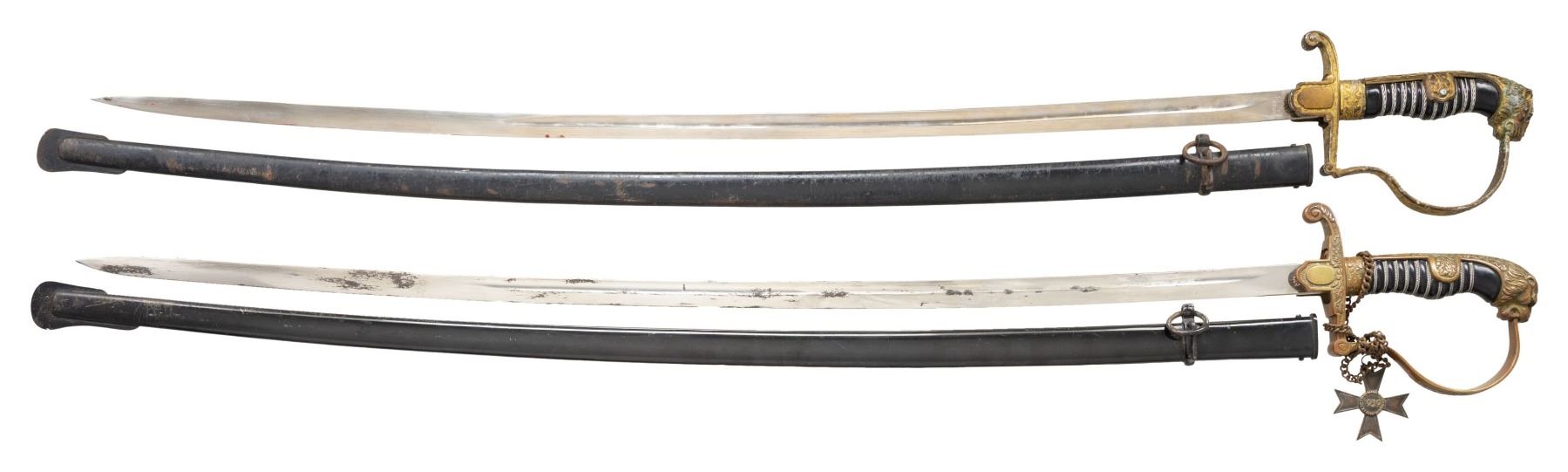 1) WWII German Army saber measuring 38 1/8" overall with a 32 1/4" plain blade. The blade has a single medium fuller and is marked on the ricasso "WMW WAFFEN". Gilded brass hilt with an eagle and party symbol on the front languet. The pommel features a lion's head with "ruby" eyes, and the grip is wire wrapped black composite material. Black enameled metal scabbard. Attached to the hilt, with a brass chain, is a War Merit Cross without swords. CONDITION: light wear overall with some oxidation spots on the blade. 2) WWII German Army saber measuring 38" overall with a 32" plain blade. The blade has a single medium fuller and is marked on the ricasso "ORIGINAL (squirrel) Eickhorn SOLINGEN". Gilded brass hilt with an eagle and party symbol on the front languet. The pommel features a lion's head with "ruby" eyes, and the grip is wire wrapped black composite material. Black enameled metal scabbard. CONDITION: light wear to the blade and moderate wear elsewhere. Hilt shows oxidation as does the scabbard. (02-24098/BF). NON-GUN. $500-800.