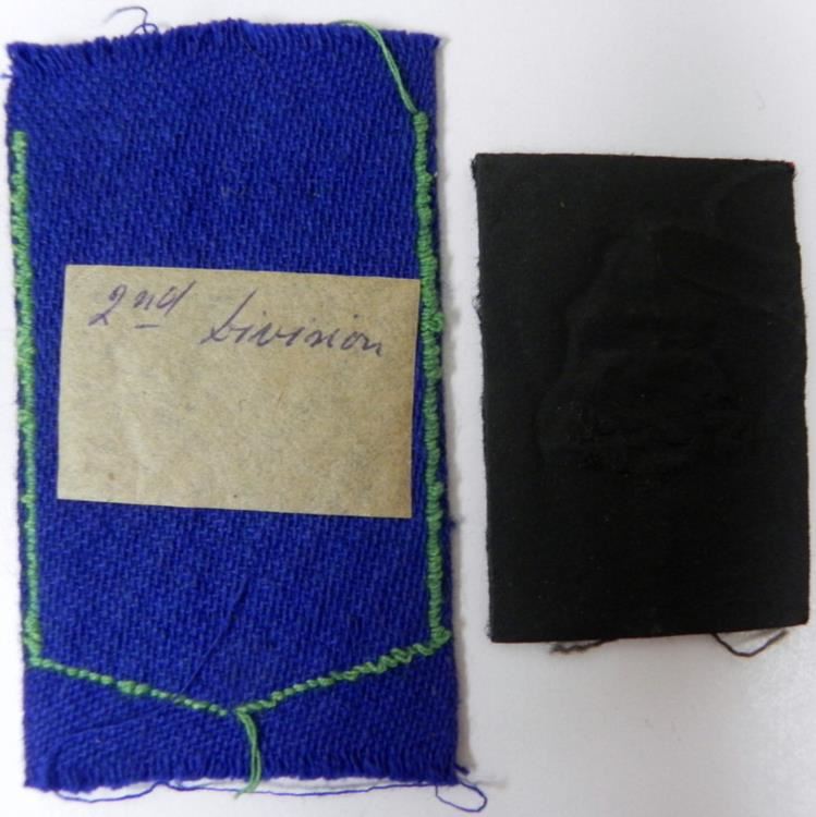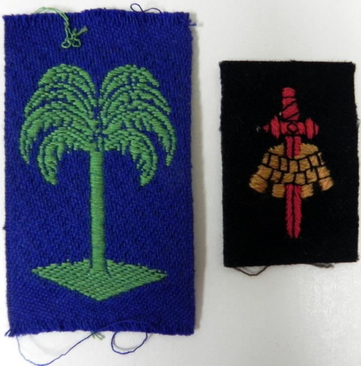 OFFERED HERE ARE 2 WWII PATCHES-PALM TREE (2ND DIV)-+BLACK PATCH W/GOLD CROWN +RED BROAD SWORD. GREEN ON BLUE PALM TREE-1 3/4" X 3"--BLACK PATCH IS 1 3/8" X 2" HAS BLACK BACKING PAPER.