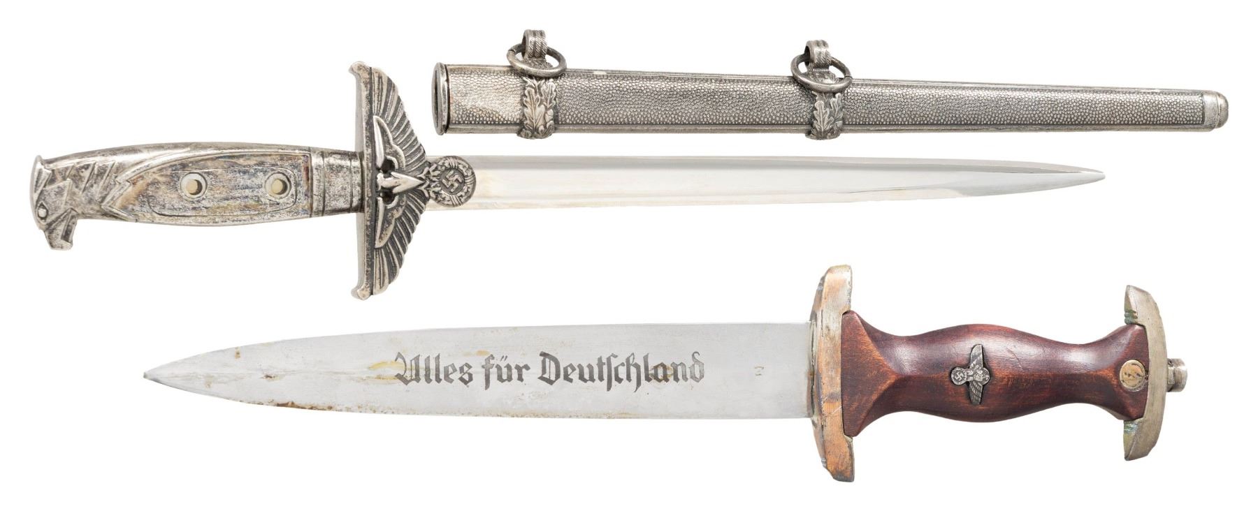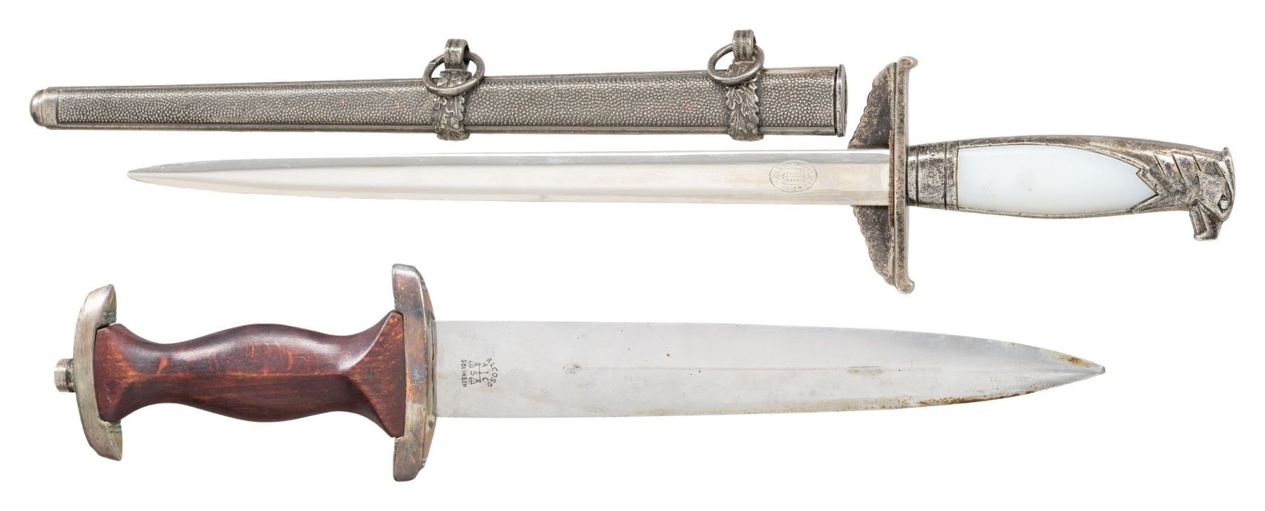 1) An original SA dagger measuring 14" overall with an engraved blade that reads " Alles fur Deutchland ". The blade is maker marked " ALCOSO (logo) SOLINGEN ". Plated crossguard is stamped "Nrh" and is paired with a plated pommel guard. Brown wooden grip with inset eagle and enameled SA button. No scabbard. CONDITION: blade may have been buffed. Plating is worn on the guards. Enamel on the SA button is missing. 2) A reproduction diplomatic dagger marked on the reverse " F. W. HOLLER (logo) SOLINGEN ". Eagle crossguard with eagle head pommel and white plastic grips (one missing). Silver finished scabbard. CONDITION: light wear overall. (02-24157/BF). NON-GUN. $300-500.