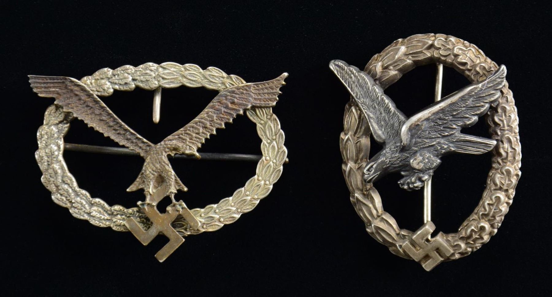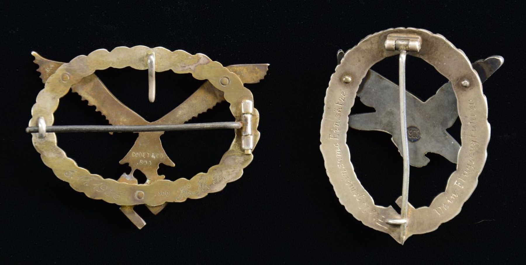 This lot contains items of questionable authenticity that may be of post-WWII manufacture. We encourage interested parties to examine items in this lot closely and in person, if possible. Preview times are available upon request. 1) AIR GUNNER. A scarce example of a WWII style German Air Gunner’s Badge without lightning. The badge features an oak leaf and laurel leaf wreath with a party symbol at the base. The center has a silvered eagle in flight. The reverse of the badge has a narrow pin with rivet construction. The back of the eagle is stamped "900". The back of the wreath is engraved "Fur 50 gemeinsome Einsatze Dein Flugzeug Fuhrer". UNATTACHED ACCESSORIES: a handwritten note translating the inscription on the badge. (02-22503/BF). 2) PILOT’S & OBSERVER’S BADGE. A very rare style 1st model combined Pilot’s and Observer’s Badge, featuring an oval wreath of laurel and oak leaves with a rising eagle grasping a party symbol in the center. The reverse has a horizontal, narrow pin with a small pocket clip at the top and shows 3-rivet construction. The back of the eagle is marked "GODET & CO. .800". The base of the wreath is engraved "5. 11. 1936" on one side and "K. H. B." on the other. The wreath is also stamped near the base, ".800". CONDITION: both badges show light overall wear. (02-22504/BF). NON-GUN. $100-300.