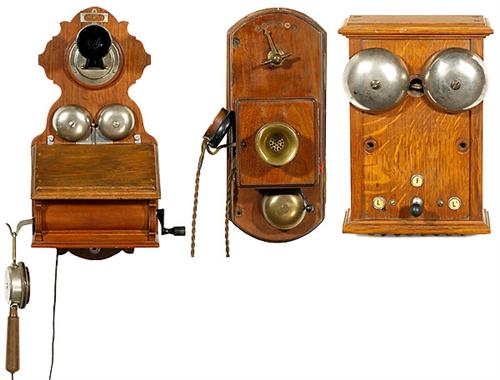 2 Wall Telephones and 1 Bell 1) Wall phone type "St f M" (1904), complete, with moveable microphone, crank replaced, with receiver by "Berliner". - 2) Intercom for 6 lines, back with small crack. - And: 3) Alarm clock for 3 lines, made in Sweden.<Br>