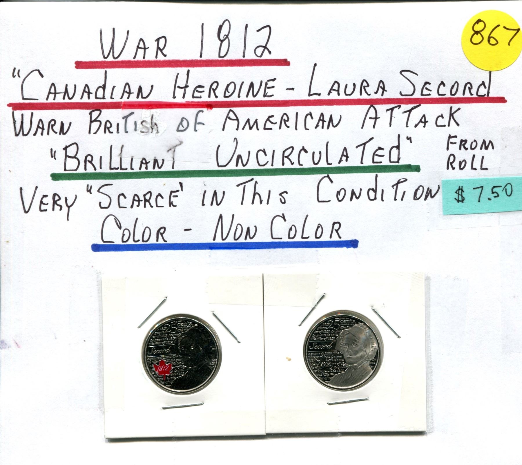 (2) War of 1812 25¢ "Canadian Heroine Laura Secord" - Colour & Non-Colour