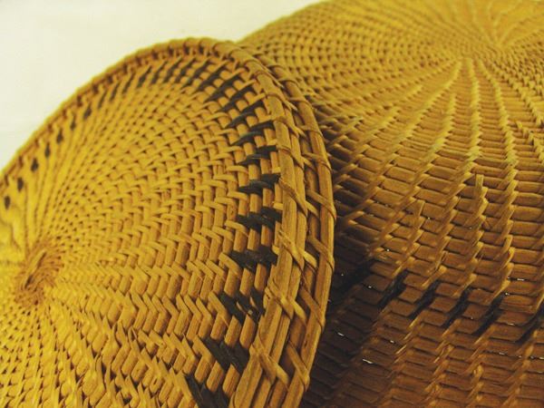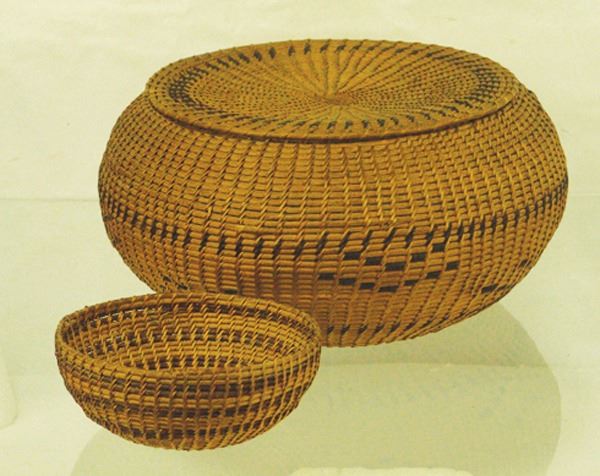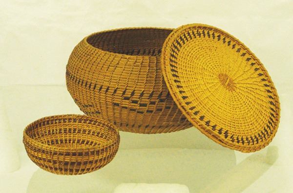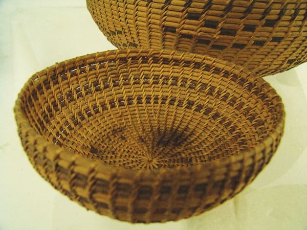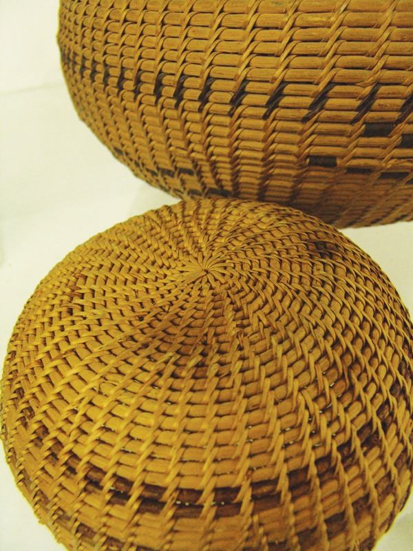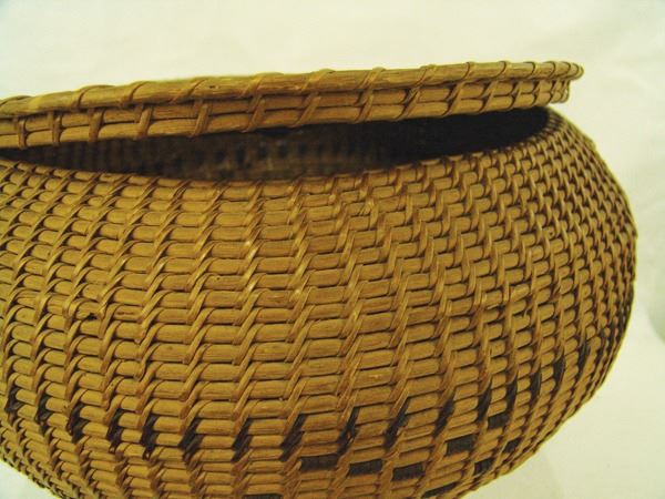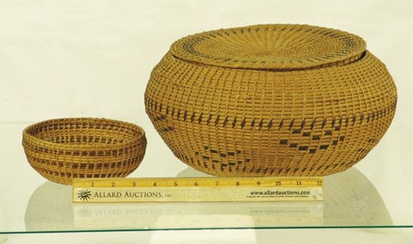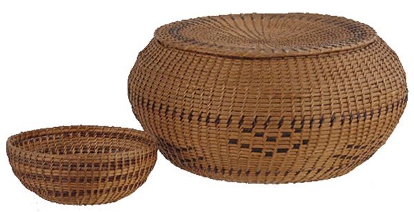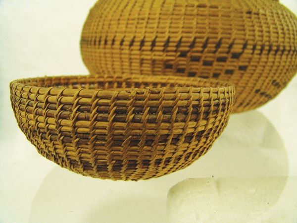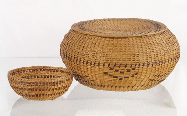 Pair of great, old, single rod gap-stitch baskets includes a small bowl, and a larger, lidded storage basket. Good condition, nice patina.Early 1900sLargest 7" x 13"