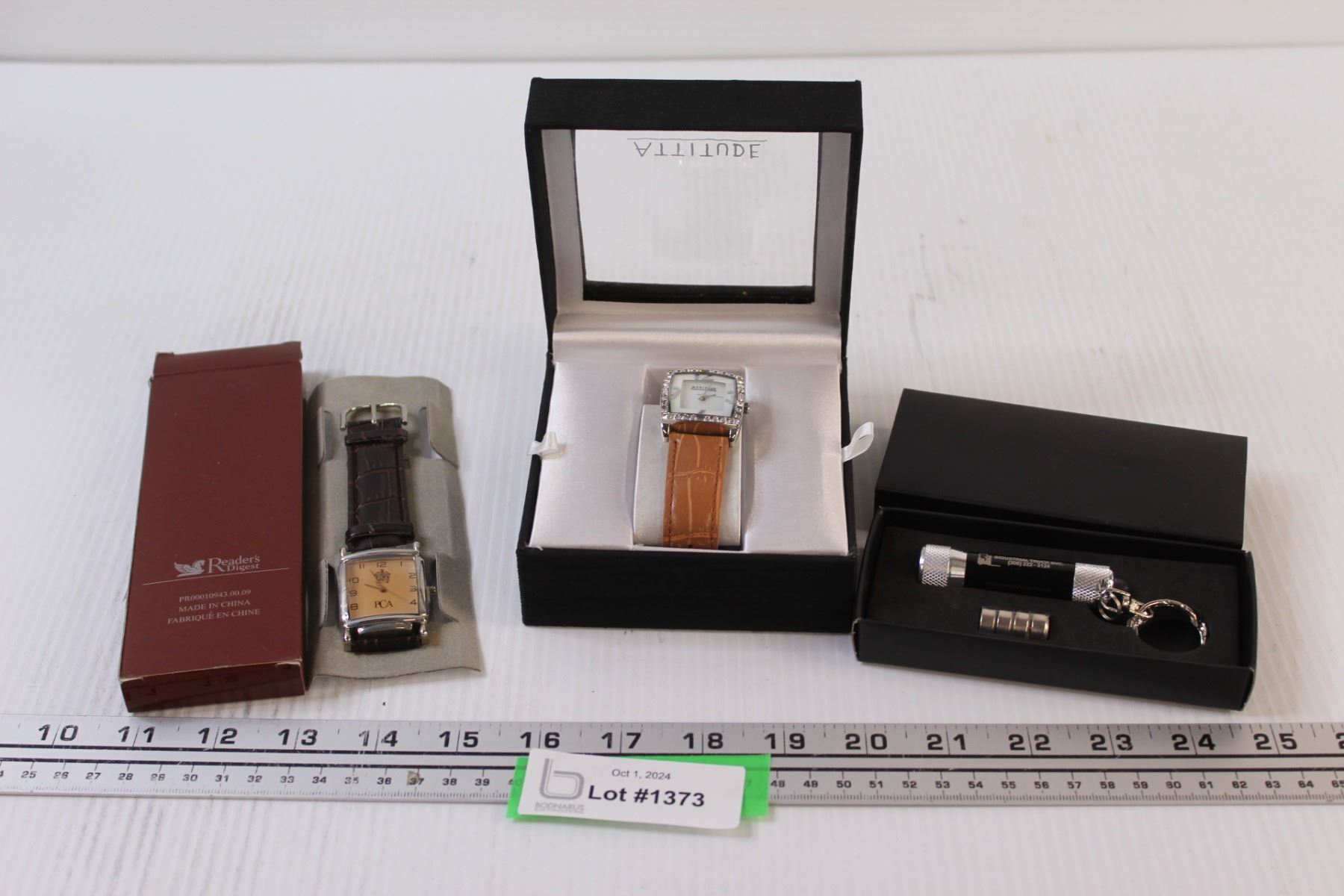 (2) Watches (Reader's Digest & Attitude) & Keychain Light - as is