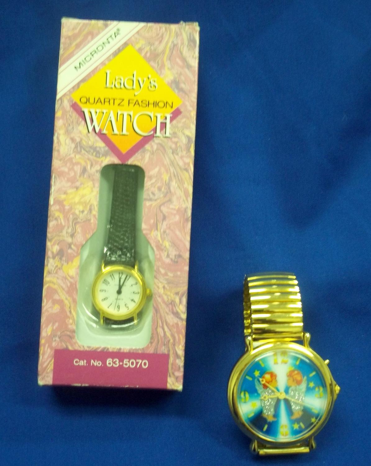 One lady's quartz fashion watch new in box and one decorative Angel watch.