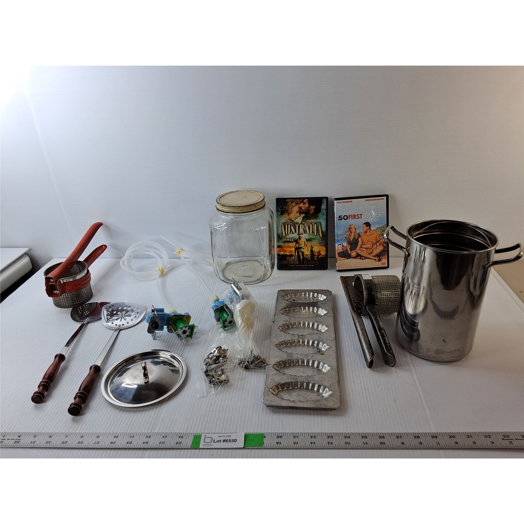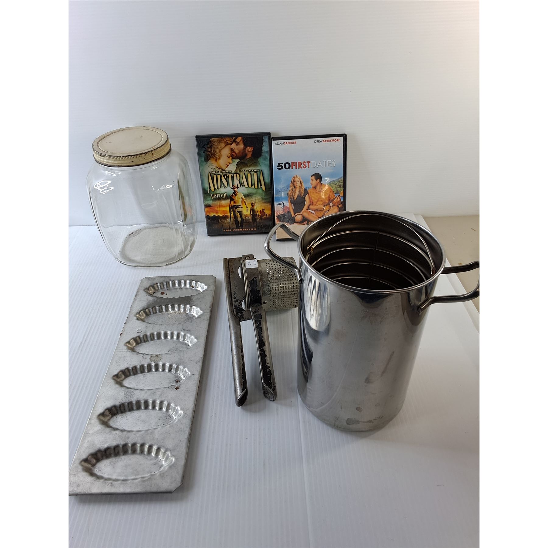(2) Water Valves, Glass Jar 8.5" Tall, (2) DVDS- 50 First Dates, Australia, Misc.