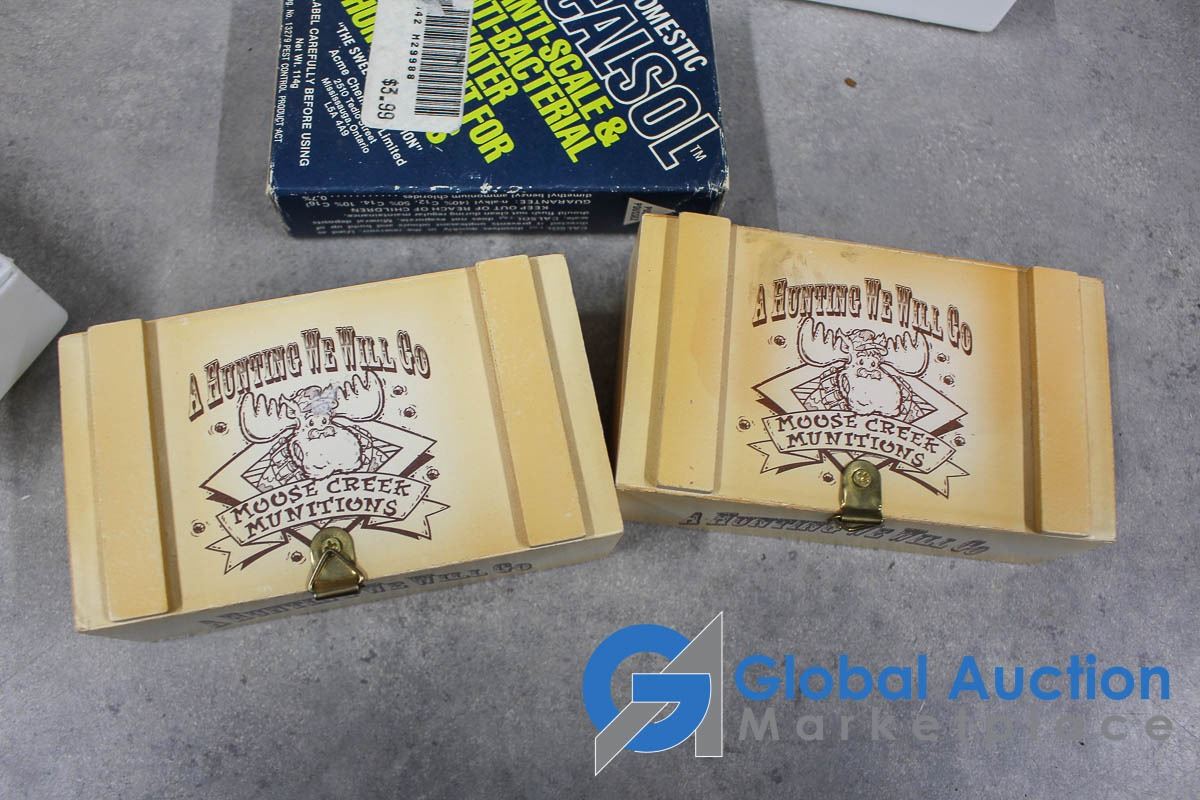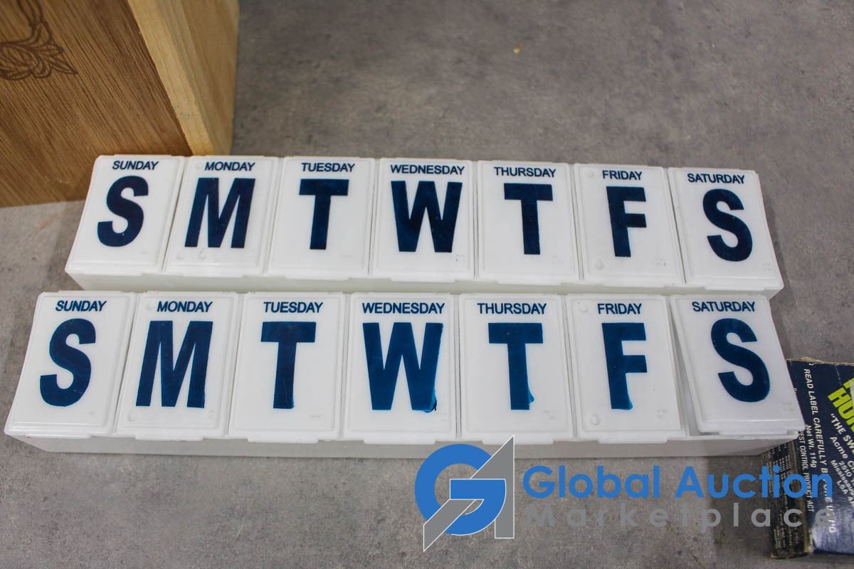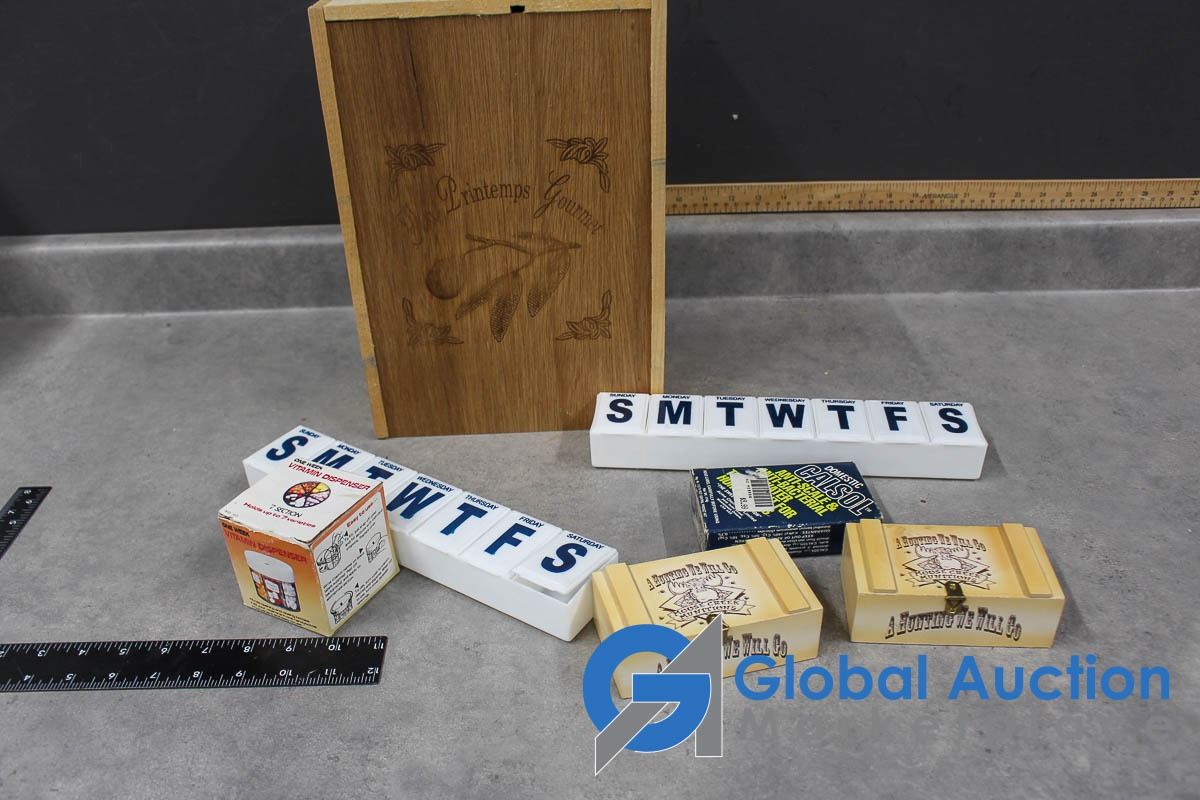 (2) Weekly Medication Organizers, (2) Small Wood Crates, Large Wood Crate w/Lid