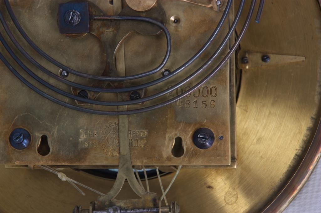 2 Weight Vienna Regulator. 7 in. porcelain dial has black Roman hour numerals, pierced black hands and brass bezel; quality brass weight driven movement with Graham deadbeat escapement and half hour coiled gong strike, quality engraved brass pulleys and brass weights, pendulum has an ebonized wood stick and brass covered bob. Movement signed on the back “Remember O.V.R.M. Co. Gerb. Resch and numbered 200,000 over 48156. In a carved walnut case having an arched crest with filigree, seashell and turned finials, turned & fluted half columns on the door and teardrop finials and filigree carving at the bottom. Good overall condition, has an original finish. 50 in. high x 16 in. wide x 6.75 in. deep.