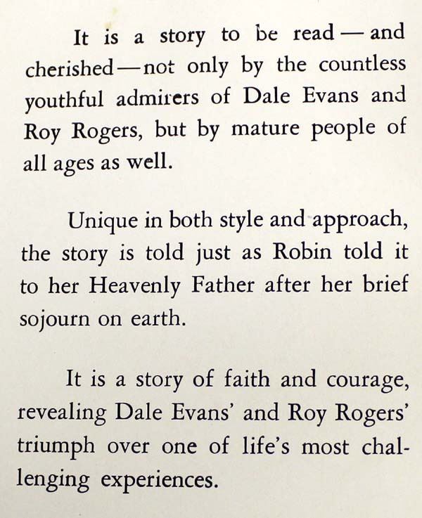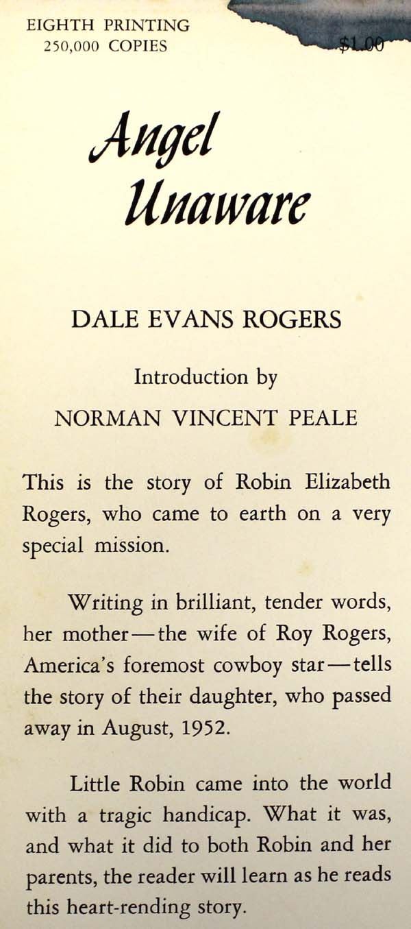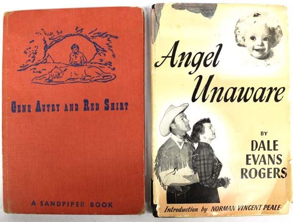 2 Western Hardback Books, includes: 1. Angel Unaware by Dale Evans Rogers with an introduction by Norman Vincent Peale, hardback book c. 1953, comes in original book jacket (worn, torn, and stained), staining on all of the pages at the top 2. Gene Autry and Red Shirt by Elizabeth Beecher, hardback book c. 1951 Young Readers' Library, Simon and Schuster--New York, writing inside of cover ''Auldin N. Prescott from Grandmuddy'' and ''Kintergartin'', table of contents page has a tear in it