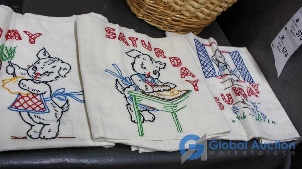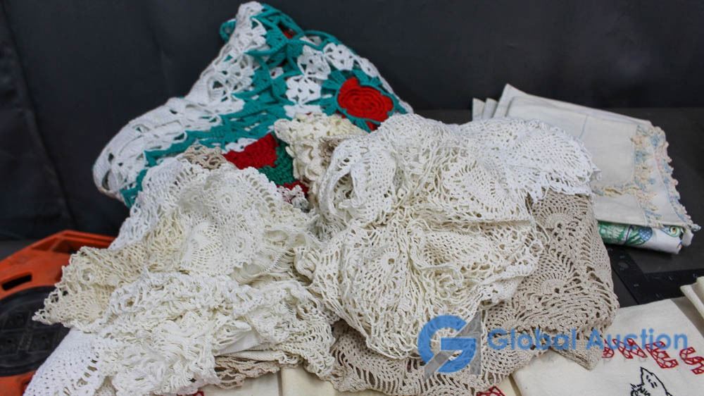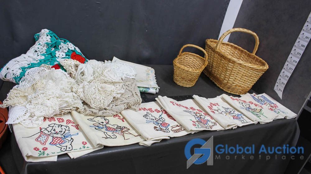 (2) Wicker Baskets with Doilies, Table Clothes, and Related