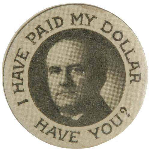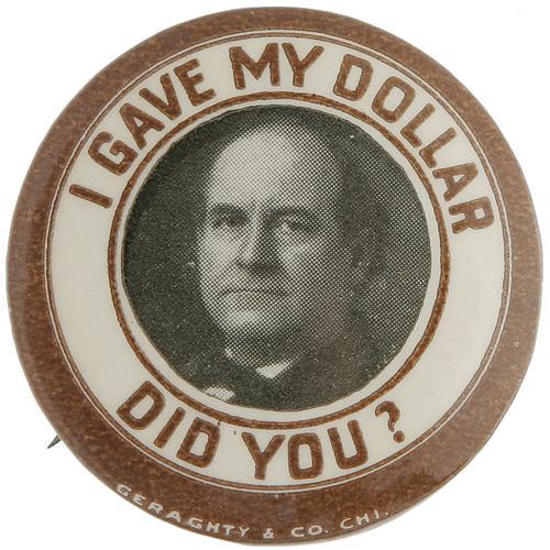 <B>Two William Jennings Bryan Celluloid Campaign Buttons,</B></I> 1 1/4", each with a central photo of Bryan, one is circled by "I Gave My Dollar Did You?" with brown letters and rim made by Geraghty & Co.; the other circled with " I Have Paid My Dollar Have You?" Both in excellent condition.<BR><BR><b>Shipping:</b> Miscellaneous Collectibles, Smal (<a target="_blank" href="http://www.heritageauctions.com/common/shipping.php">view shipping information</a>)