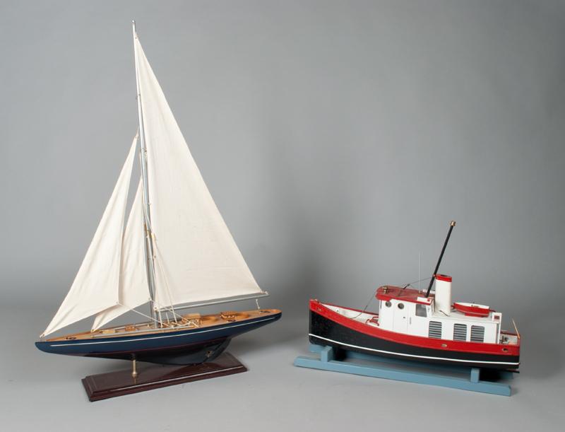 Includes a large sail ship attached to wooden stand, together with a painted fishing boat with wood stand. Tallest 34" H. Both with wear consistent with use.
