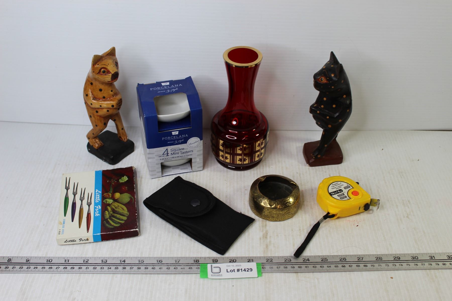 (2) Wooden Cats - 16' Measuring Tape - (4) Porcelain Mini Tasters - Misc. Items