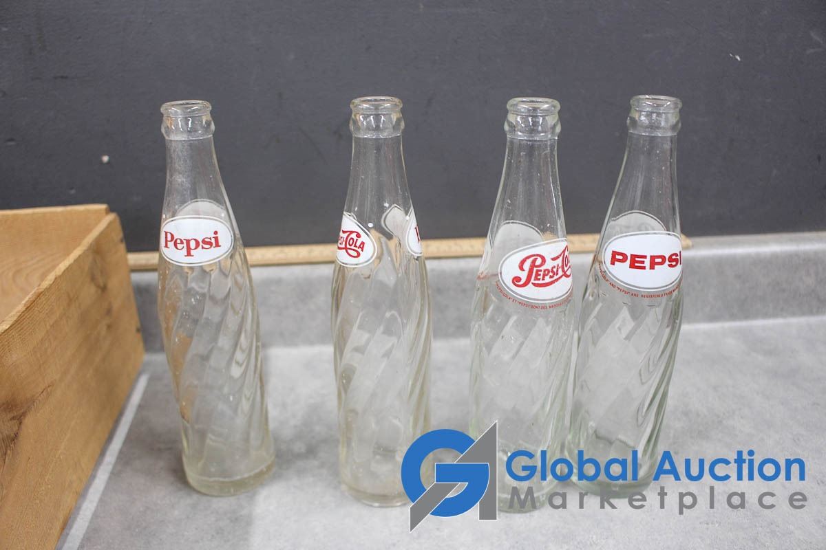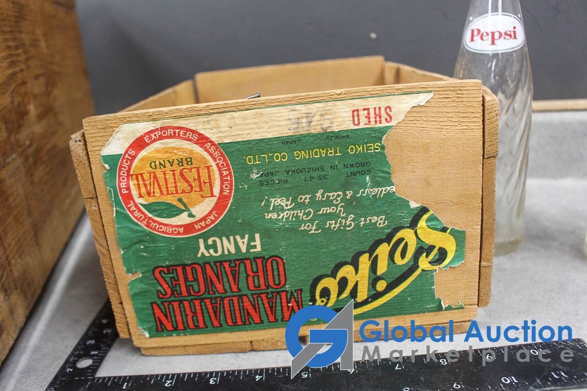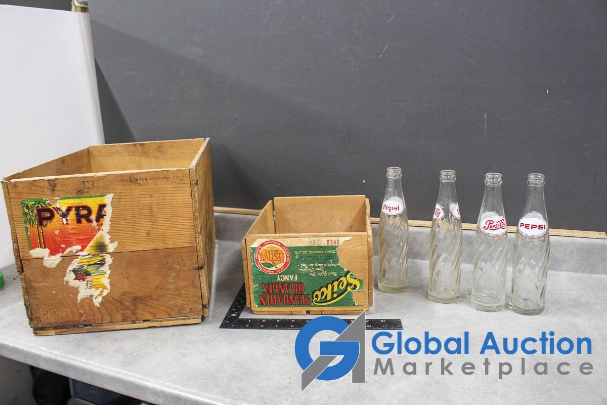 (2) Wooden Fruit Crates and (4) Glass Pepsi Bottles