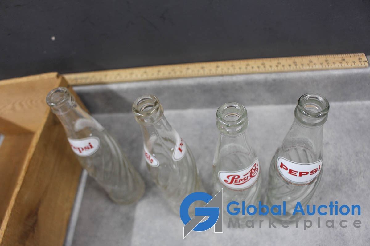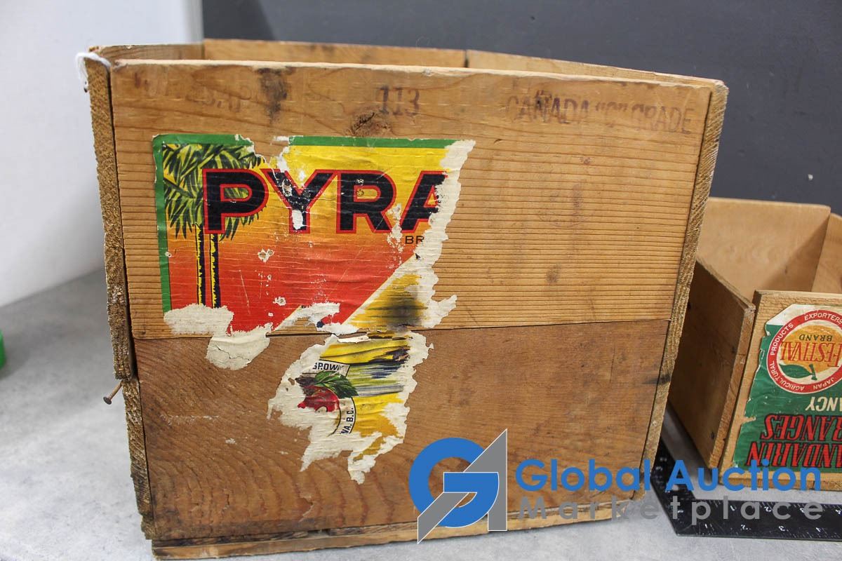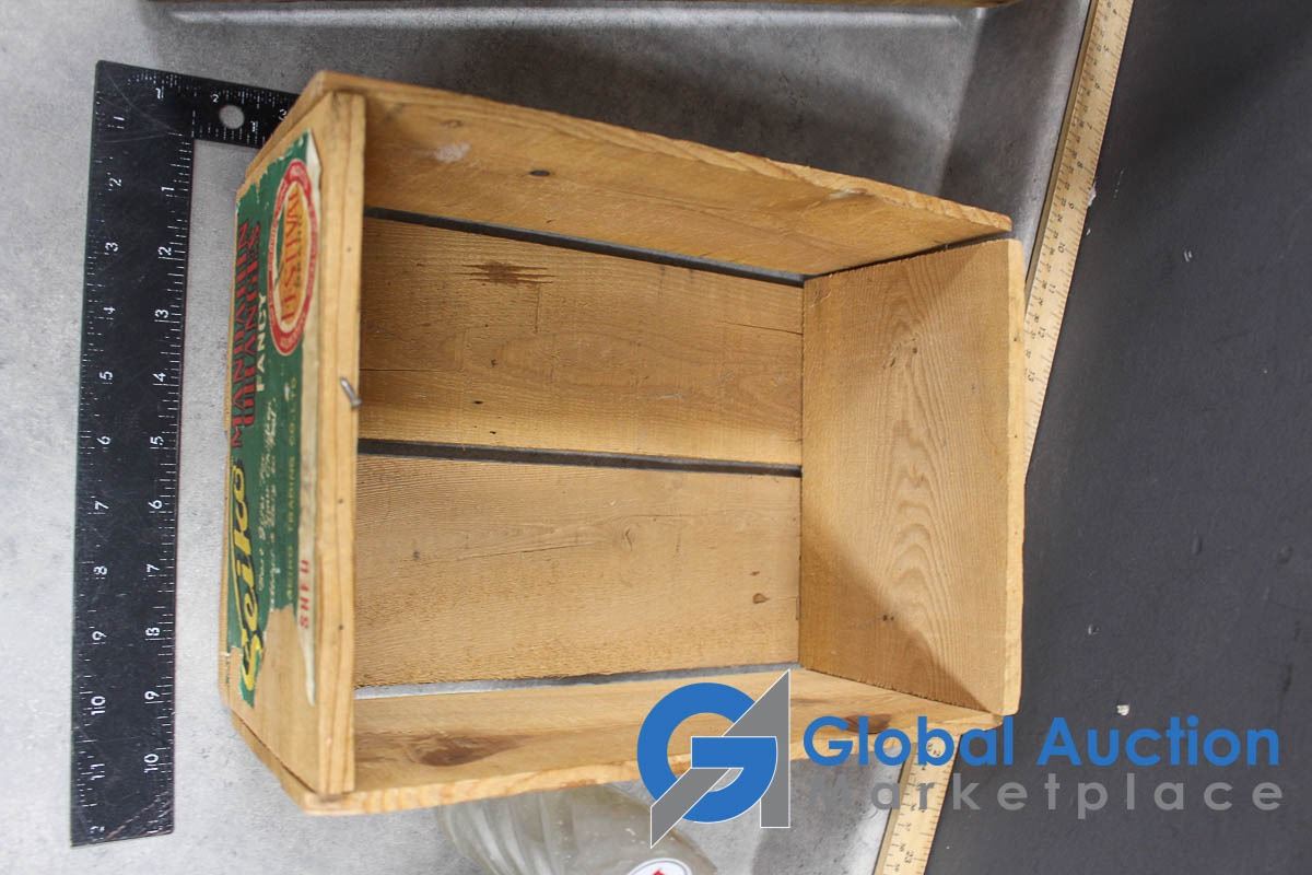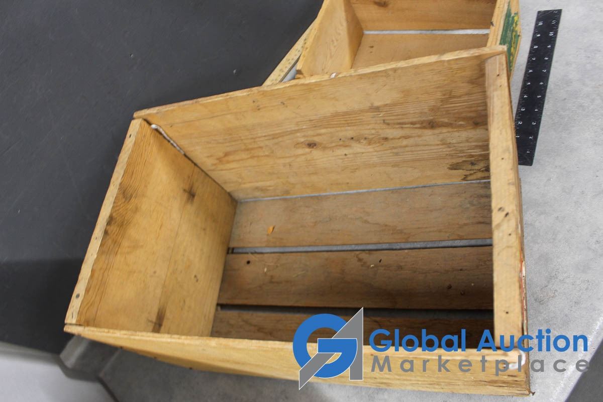 (2) Wooden Fruit Crates and (4) Glass Pepsi Bottles
