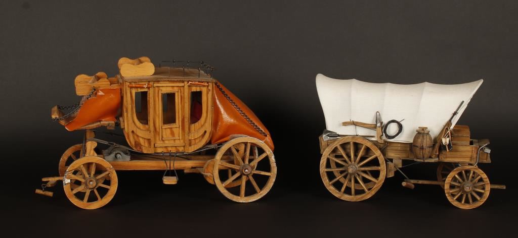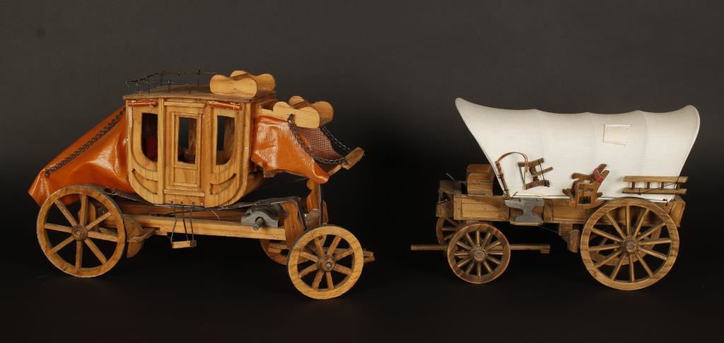 Covered wagon and stagecoach. Great western decorators, nicely made and very detailed.