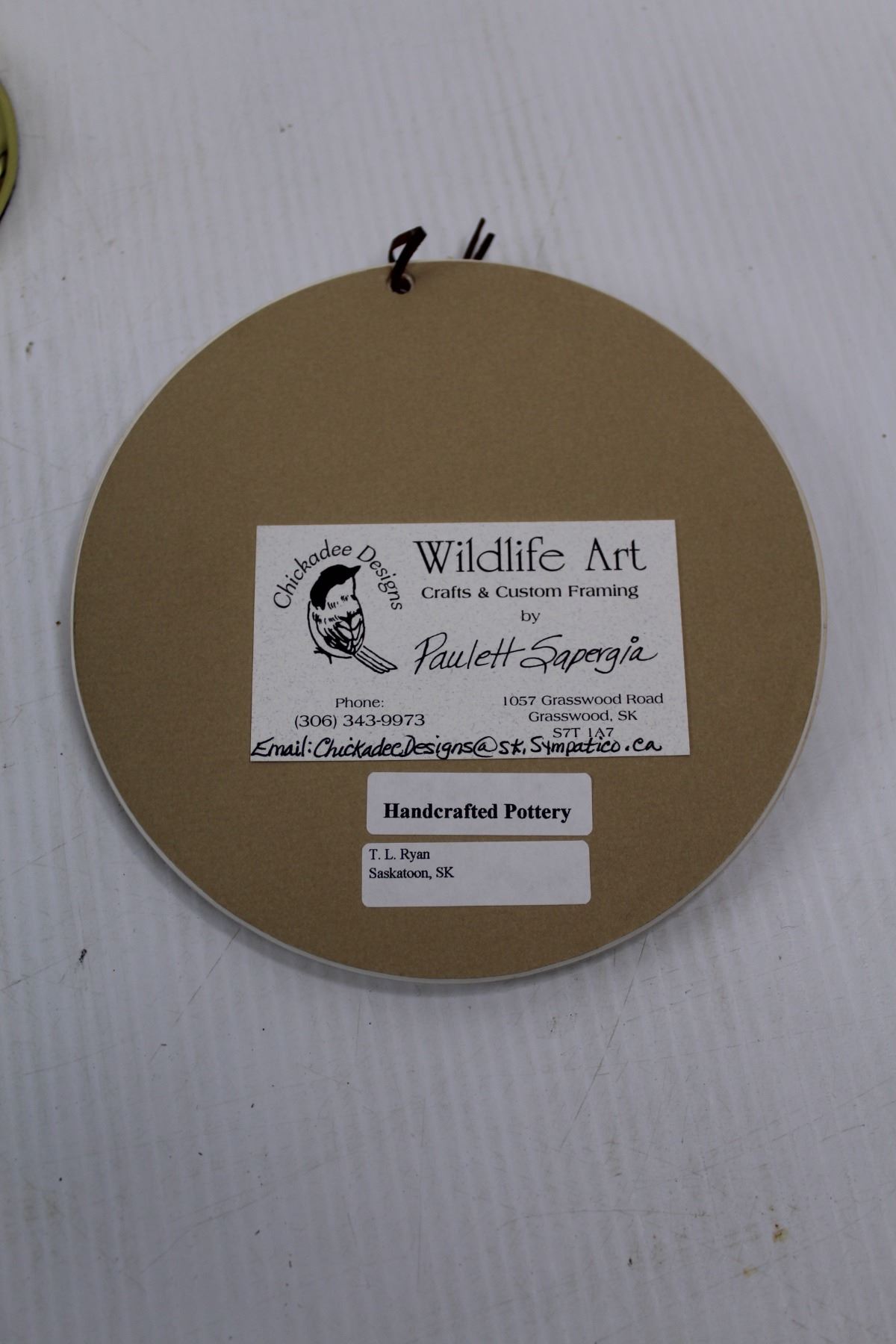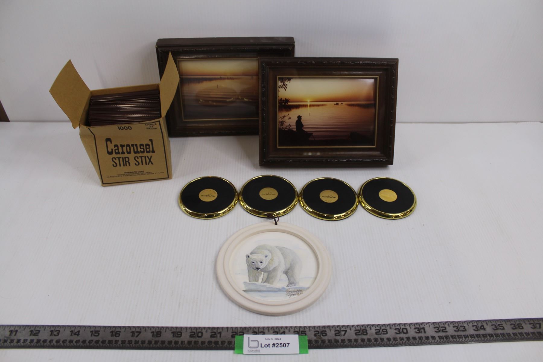 (2) Wooden Picture Frames 9.5"x7.5", Box of Carousel Stir Stix, (4) Canadian Cable Plant Coasters, Round Clay Chickadee Designs Polar Bear Painting