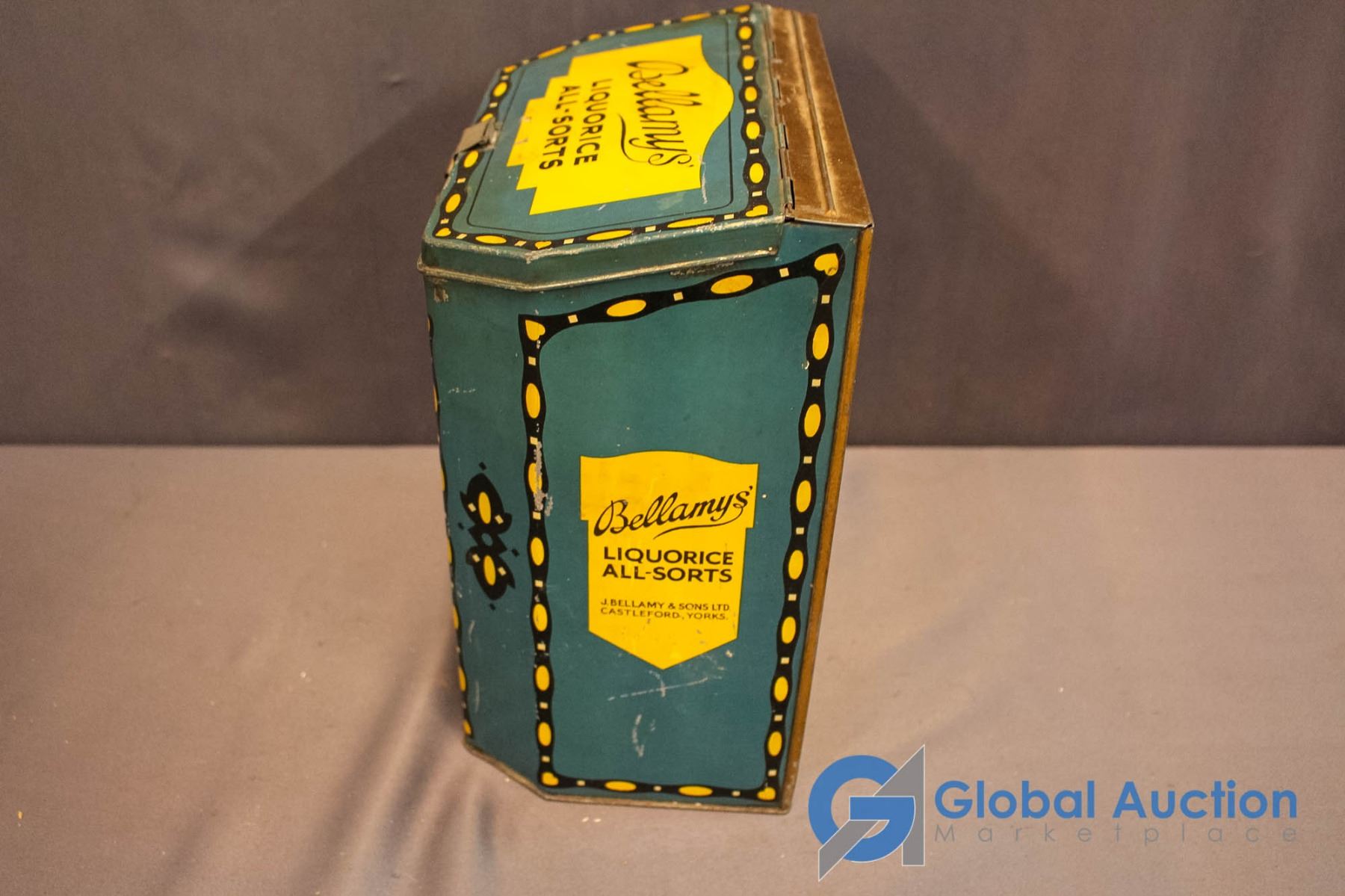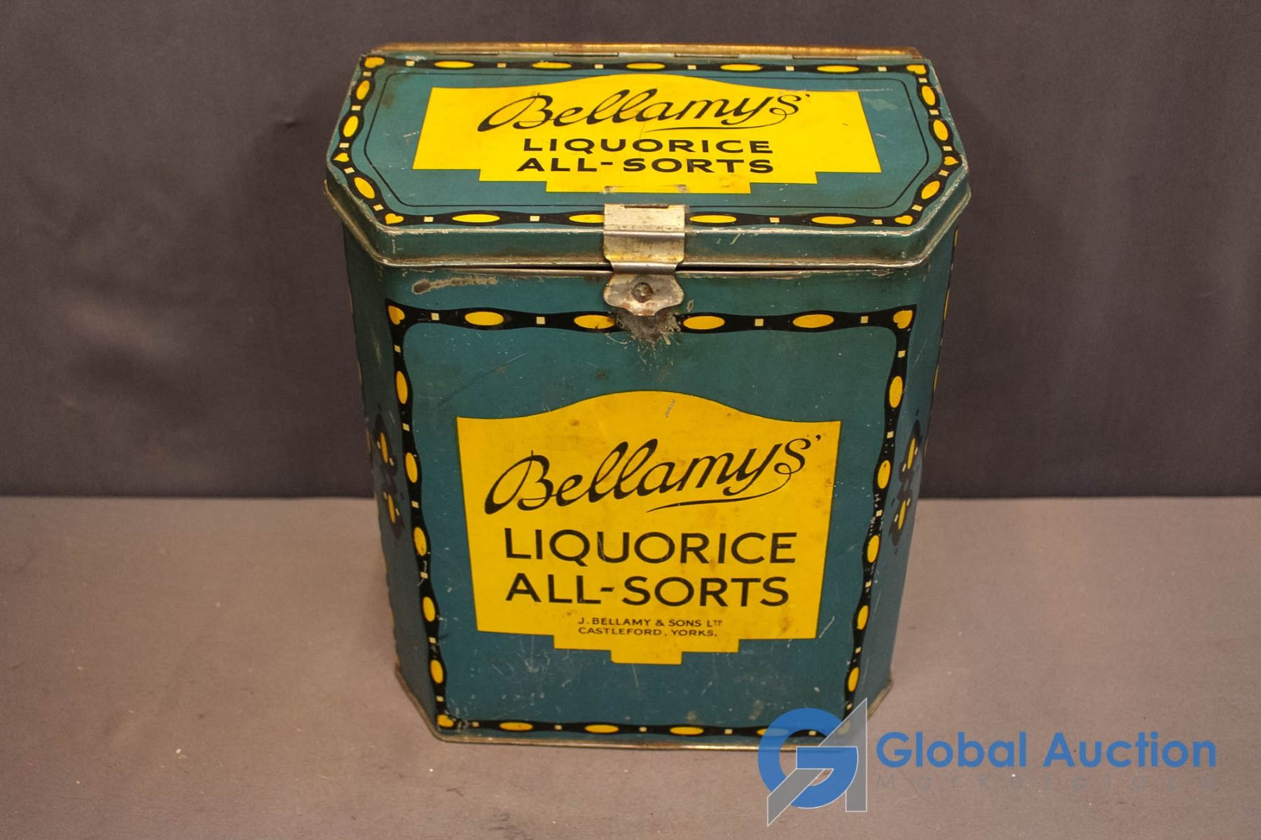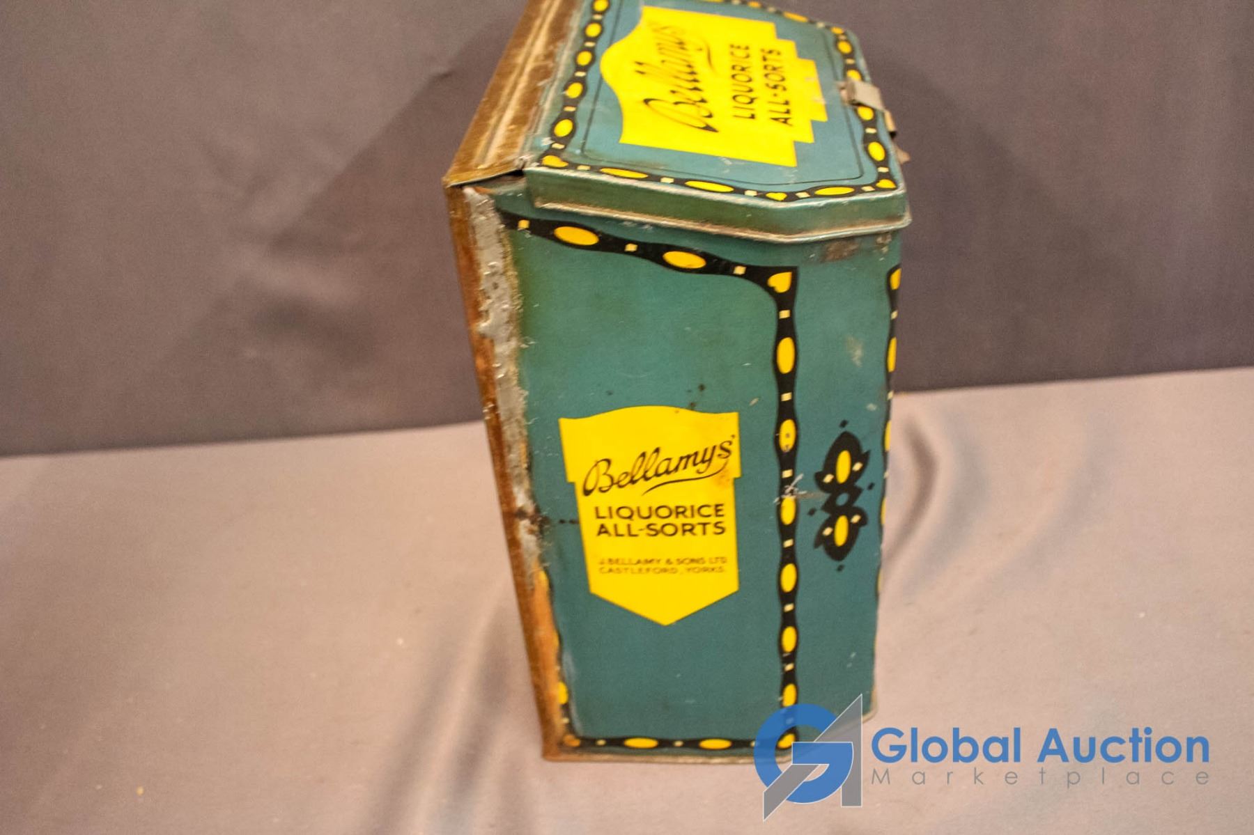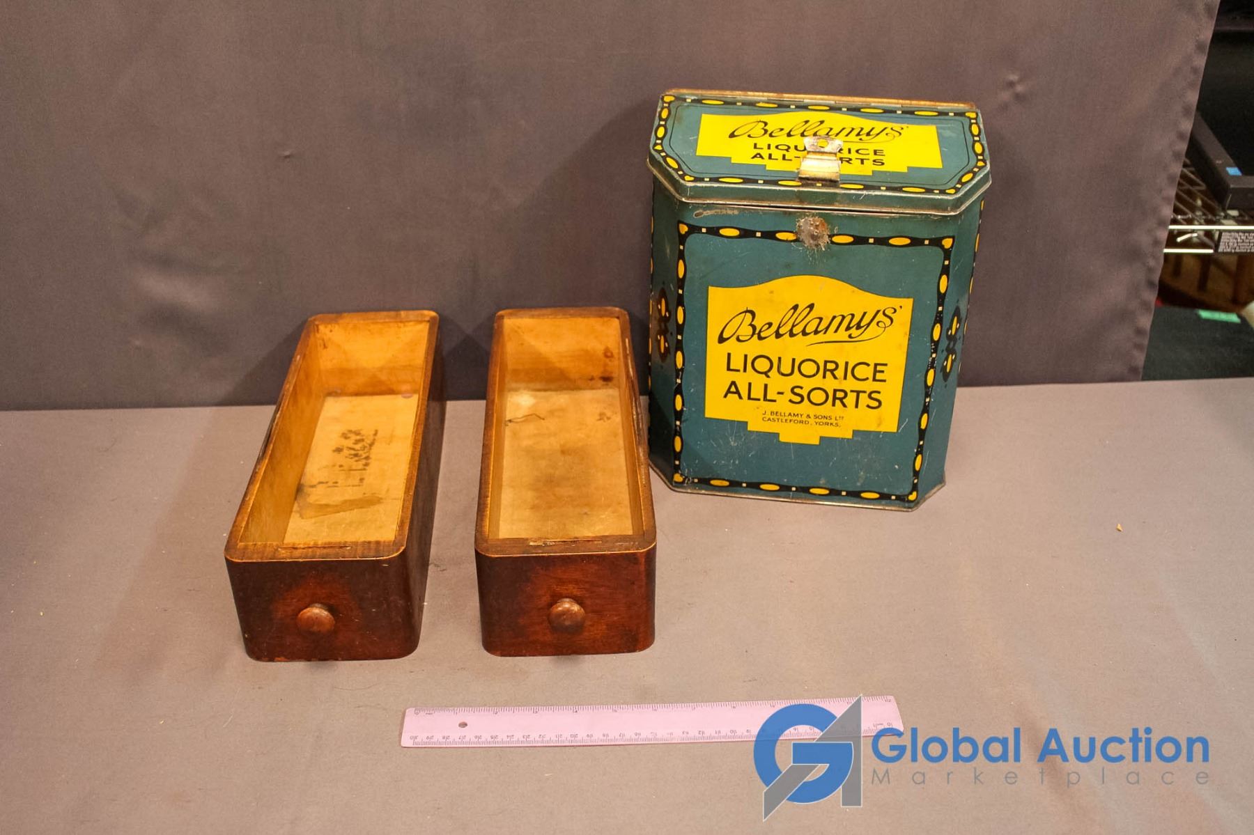 (2) Wooden Sewing Machine Drawers & Vintage Bellamy's Liquorice All-Sorts Tin with added latch