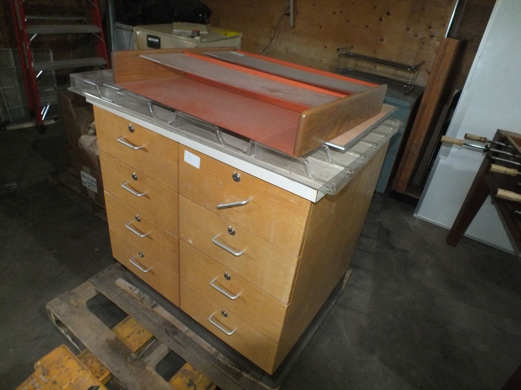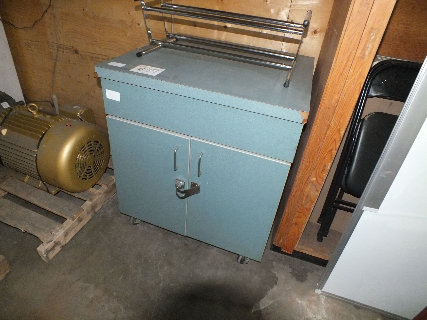 2 Wooden Storage Cabinets, one is on wheels, 31"l 28"w 33 1/2"h, 29"w 36 1/2"l 36"h, you get a couple pamphlet holders...used