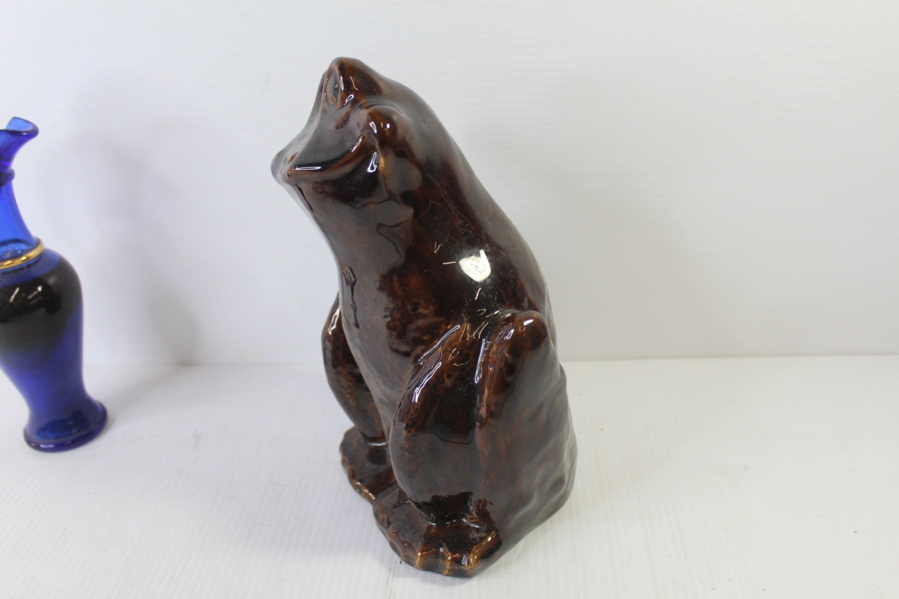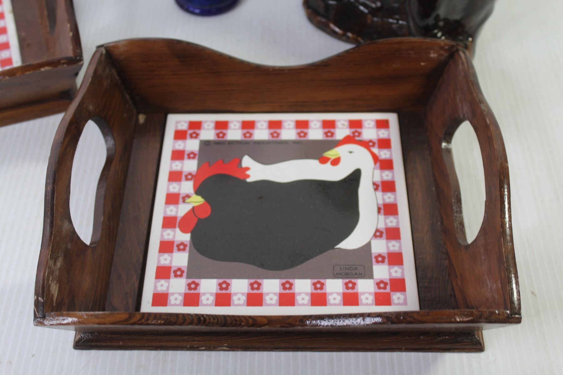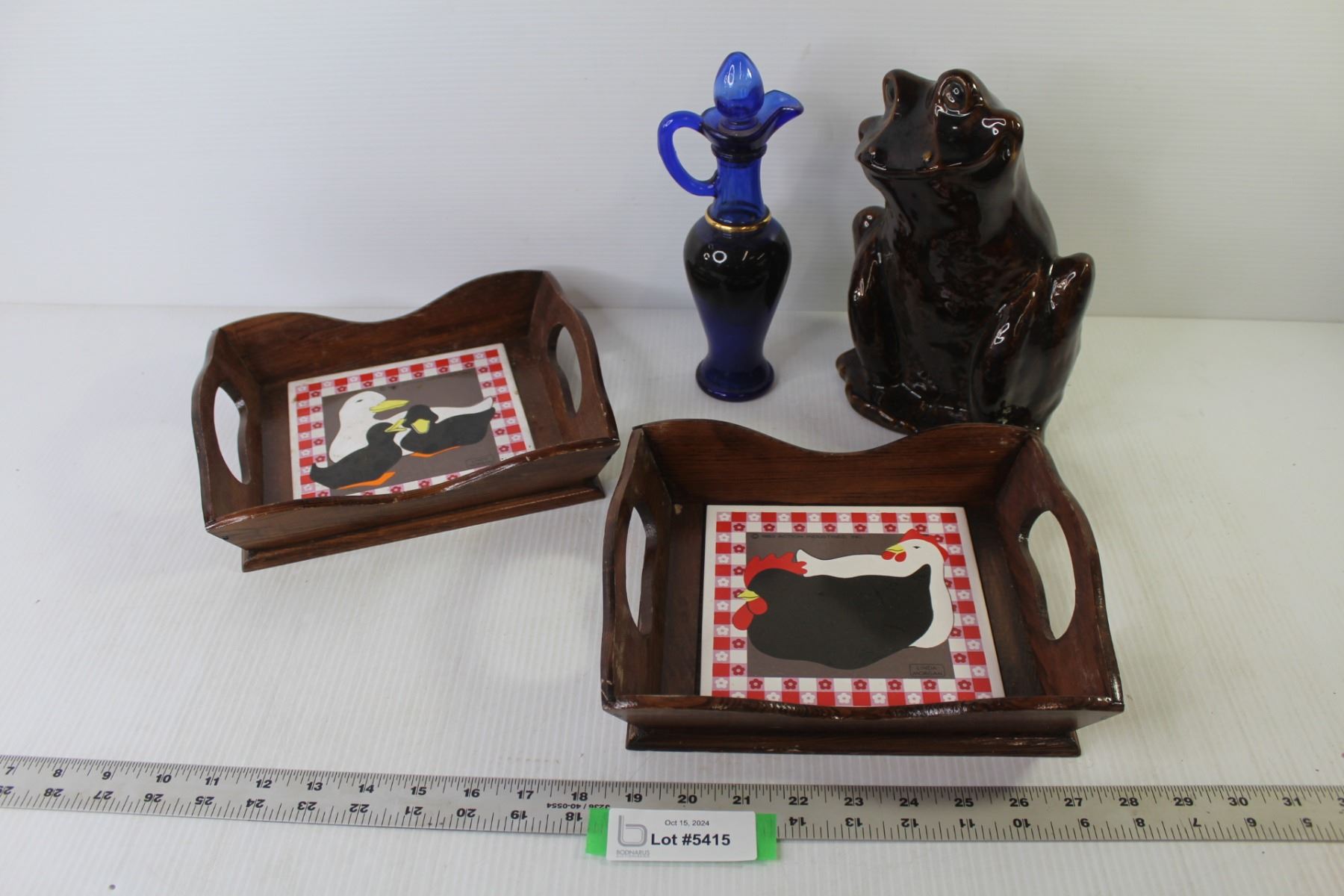 (2) Wooden Trays w/Handles - Ceramic Frog - Blue Glass Pitcher/Decanter