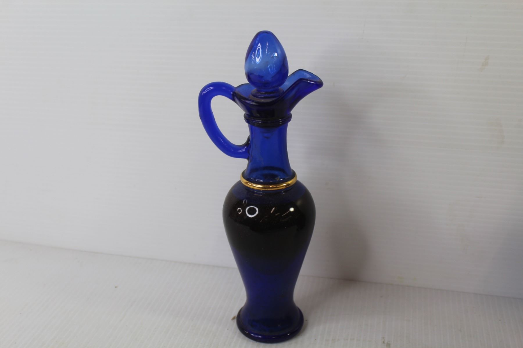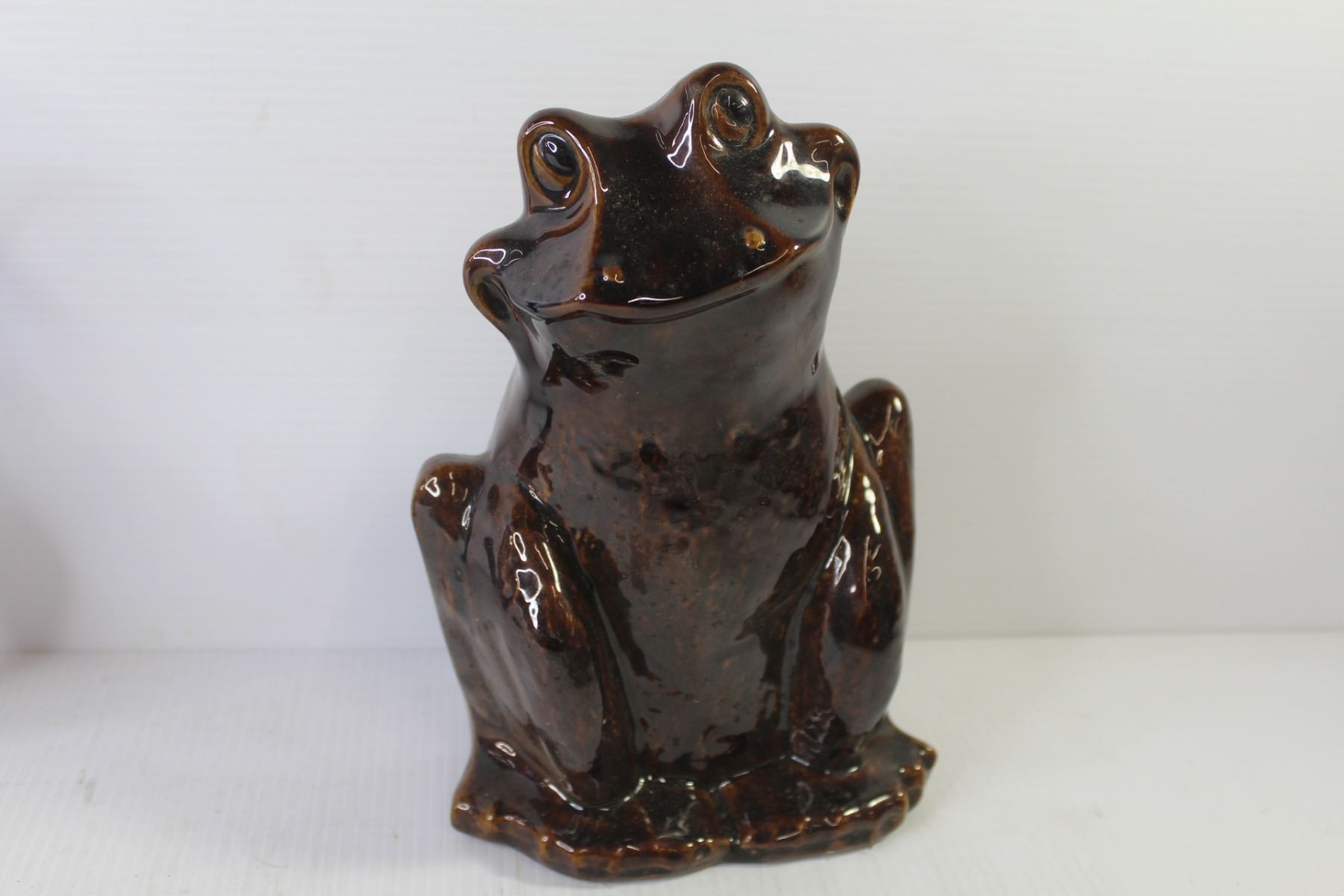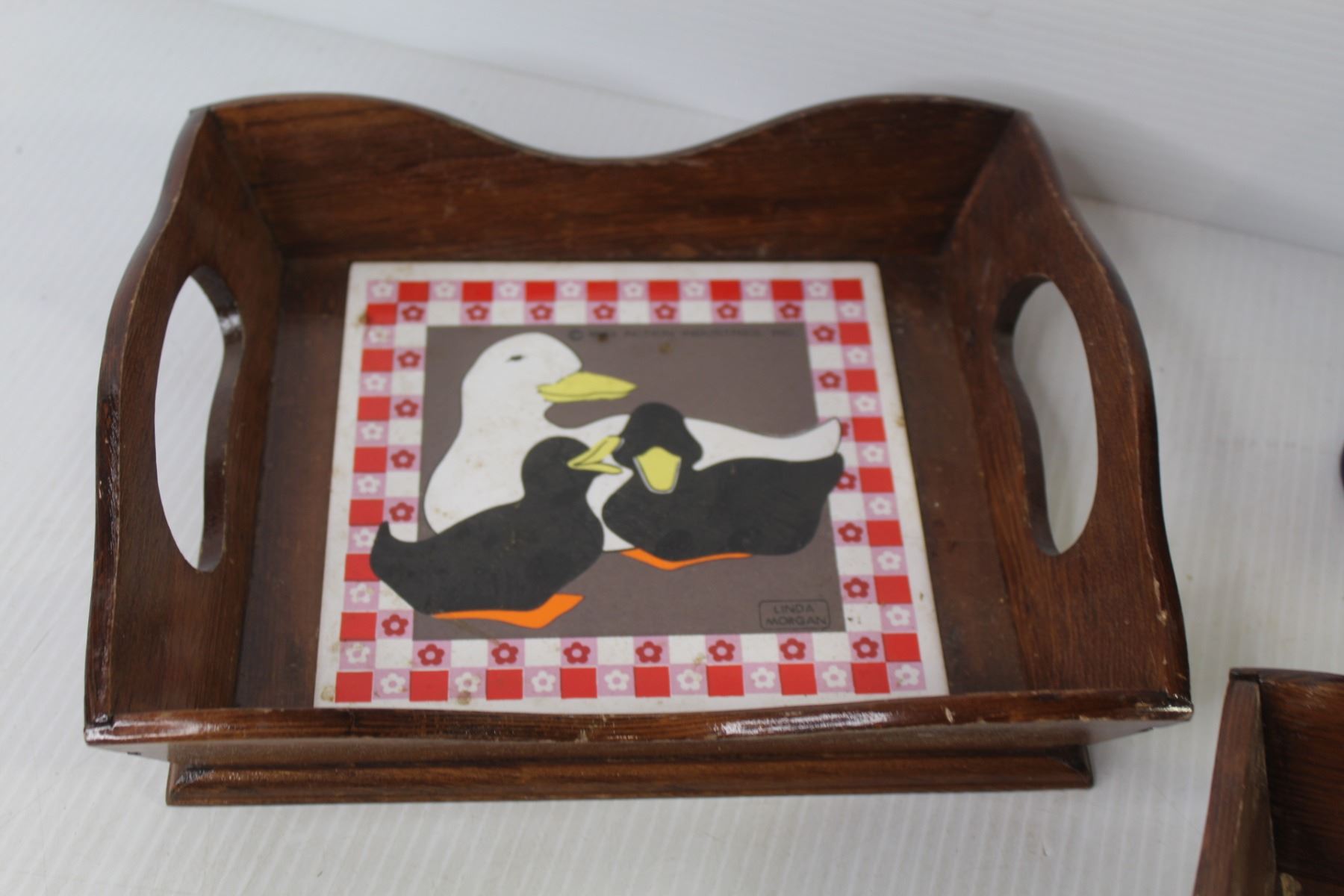 (2) Wooden Trays w/Handles - Ceramic Frog - Blue Glass Pitcher/Decanter