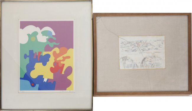 1) Small watercolor illegibly signed in the lower left. [Sight: 5 1/2" H x 8" W; Frame: 13 1/2" x 16 3/8" W]. In good condition. Unexamined out of glass. 2) Abstract offset lithograph, signed illegibly in pencil in the lower left. [Sight: 12 1/2" x 10"; Frame: 18 1/2" H x 16" W]. In good condition.