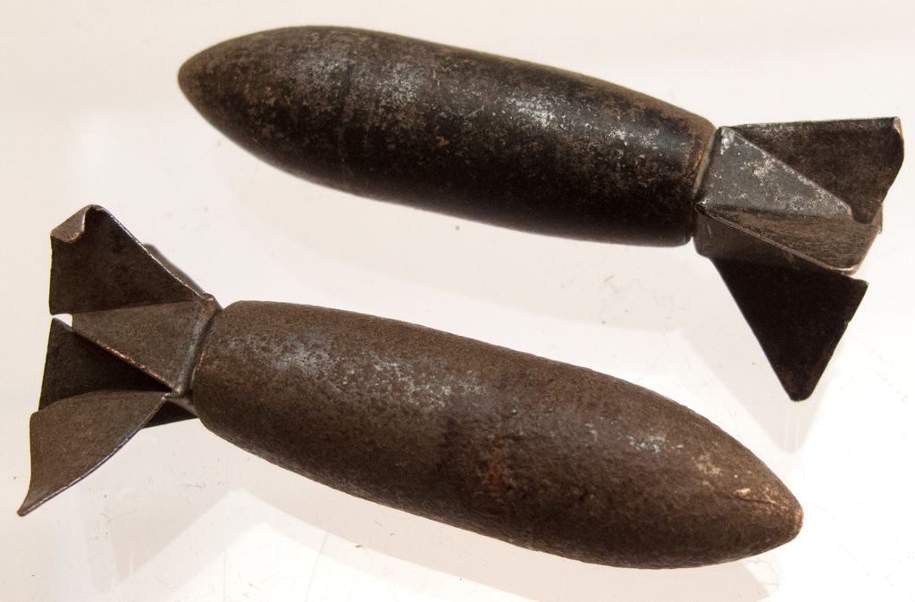 Lazy Dog "bombs" were small, unguided kinetic missiles, each measuring 1.75 inches (44 mm) in length, 0.5 inches (13 mm) in diameter, and weighing 207 grains, about 0.47 ounces (13 g). LAZY DOG anti-personnel missiles were designed to spray enemy troops with small projectiles with three times the force of standard air-burst bombs. These two bombs were obtained from a bombardier who flew on a B-25 during World War II. They would have been thrown out the bomb bay on return trips after bombing runs over enemy forces. Their force would penetrate Nazi helmets.