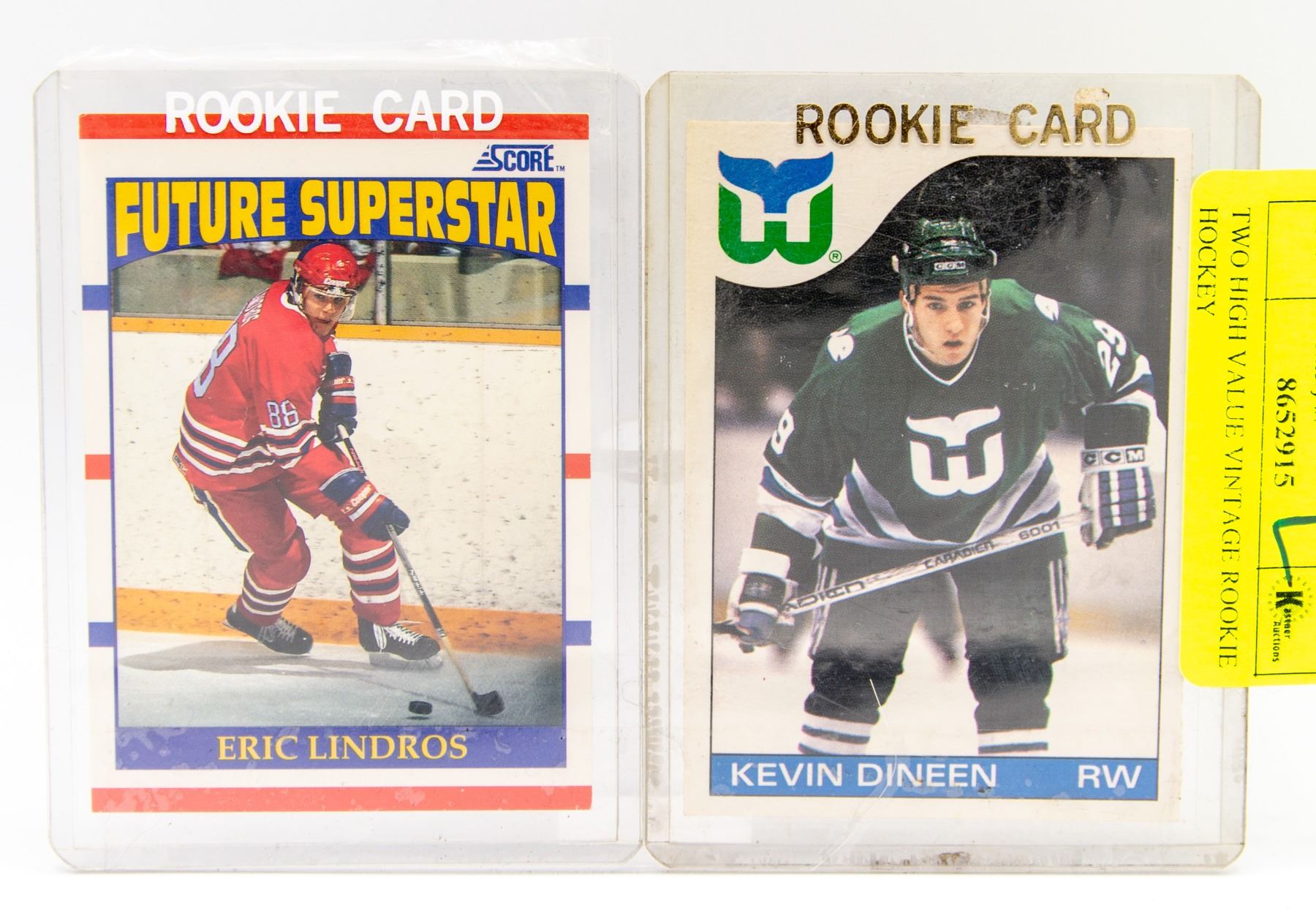 CARDS - 1990 SCORE - ERIC LINDROS "FUTURE SUPERSTAR" AND 1985 O-PEE-CHEE KEVIN DINEEN HARTFORD WHALERS ROOKIE CARD