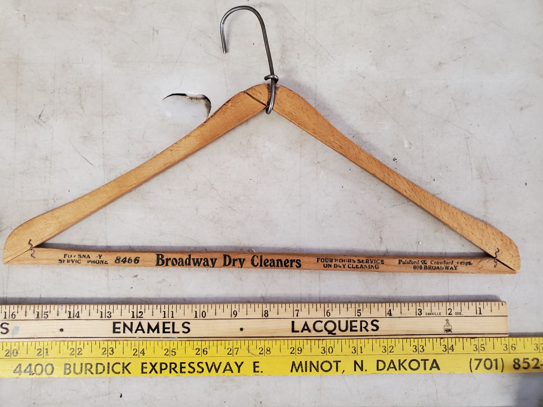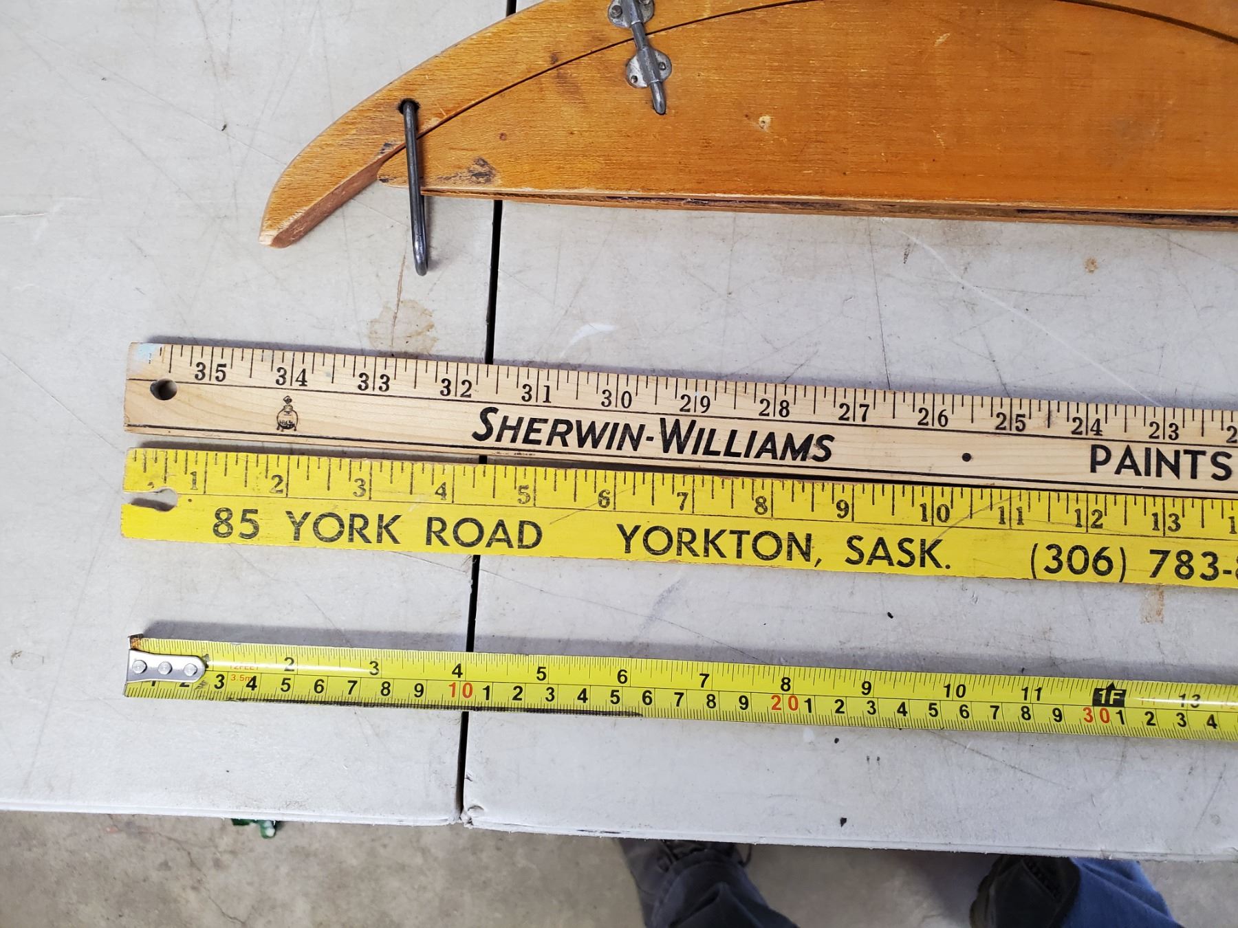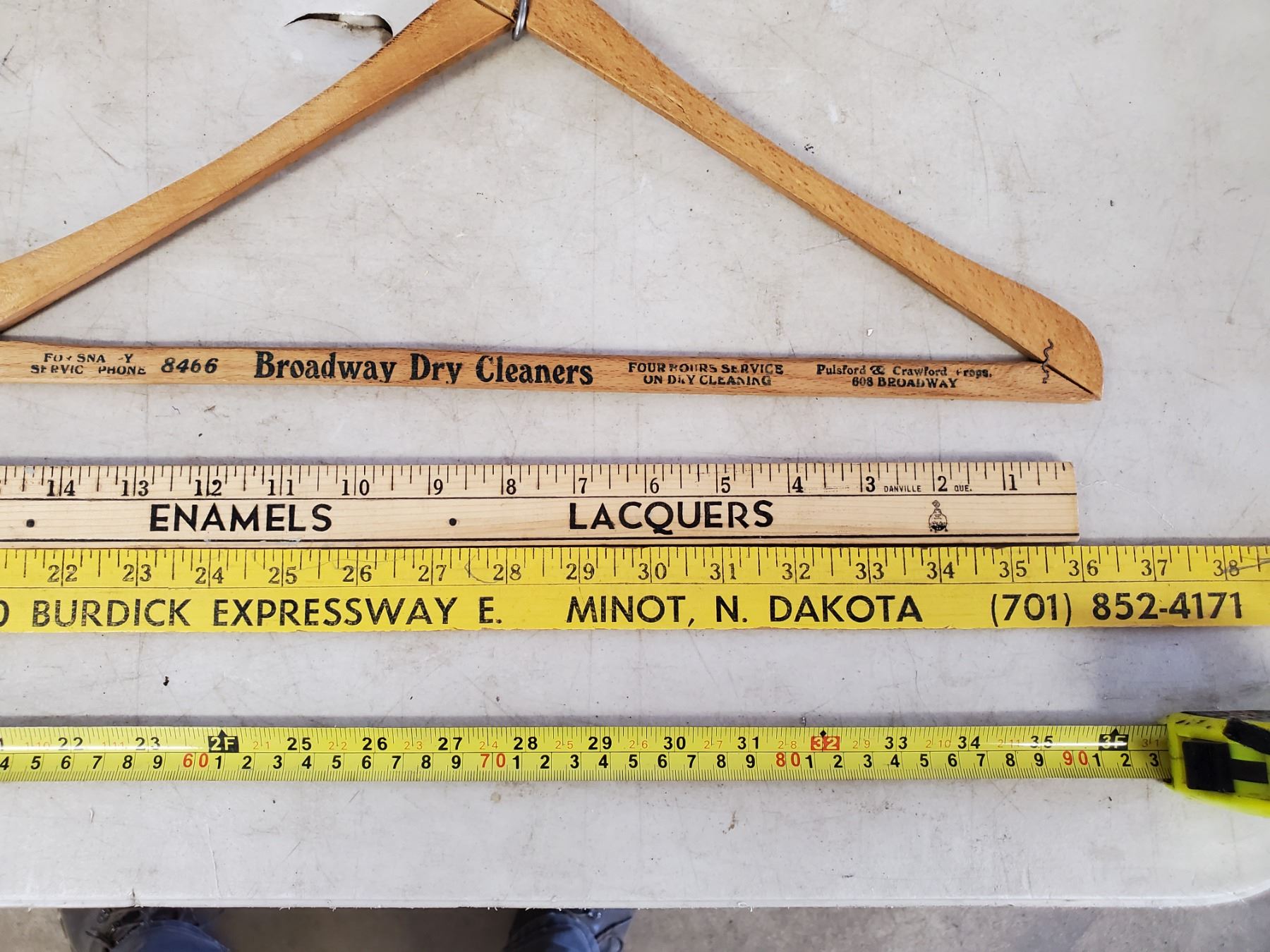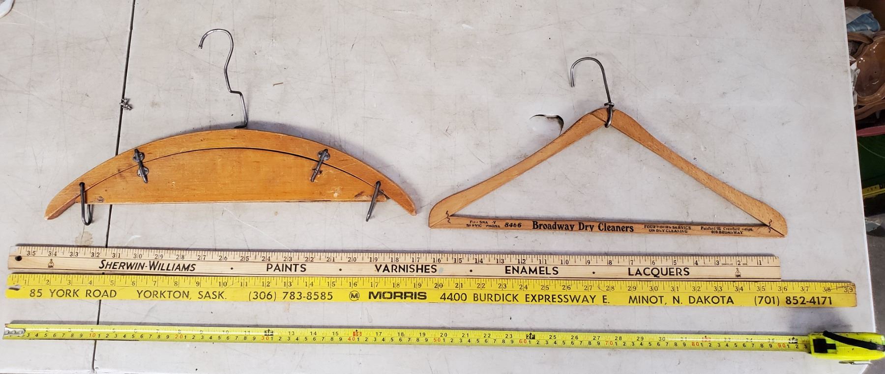 2 YARD STICKS - MORRIS & SHERWIN WILLIAMS & WOODEN HANGERS (1 BROADWAY DRY CLEANERS)