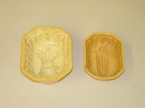 (2) YELLOW WARE FOOD MOLDS: (1) 5 1/4" MOLD W/ EAR OF CORN (5 1/4" L X 4" W X 2 1/2" T) & (1) 6 1/4" MOLD W/ SHEAF OF WHEAT (6 1/4" L X 4 3/4" W X 3" T) - WEAR