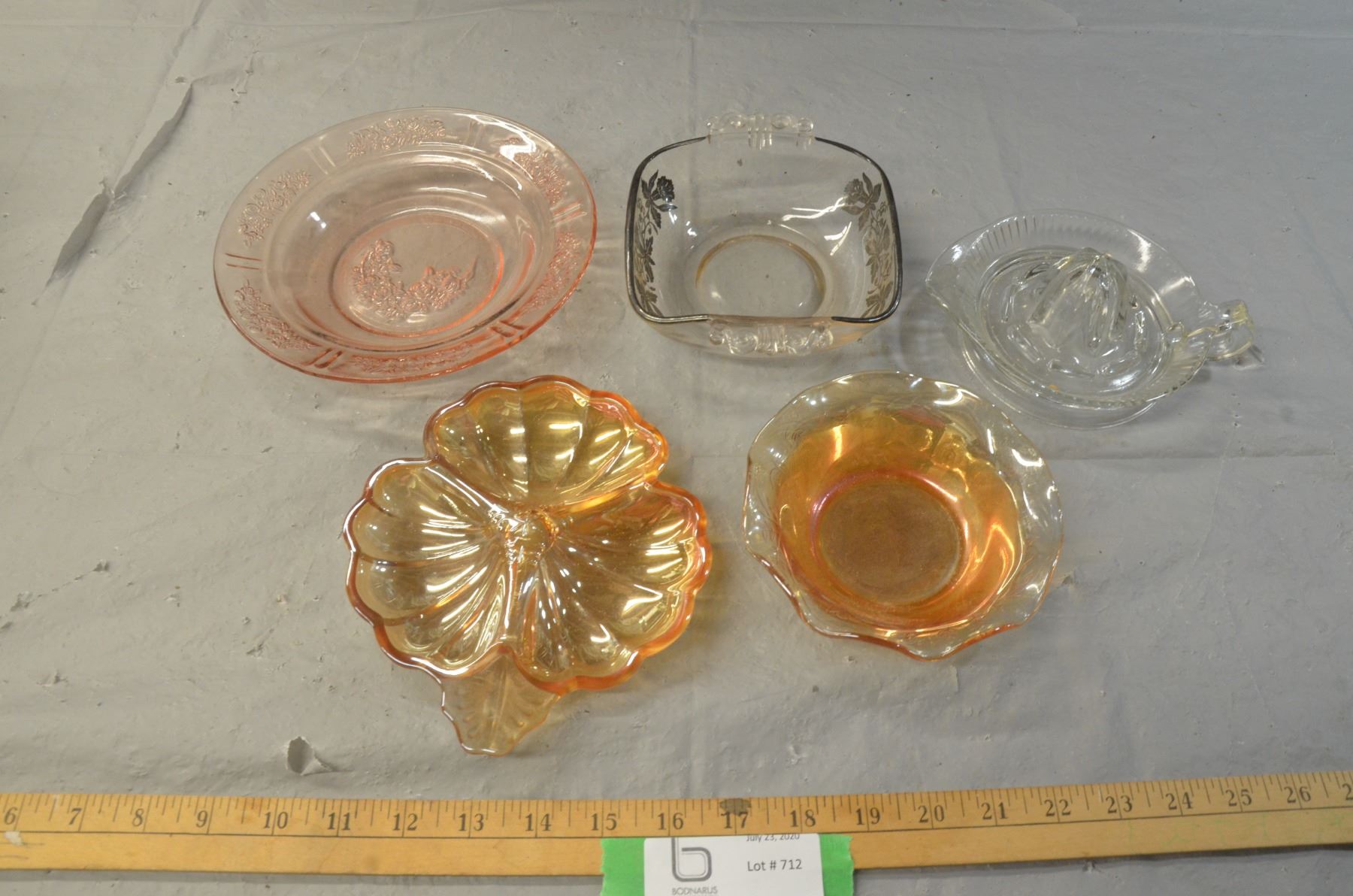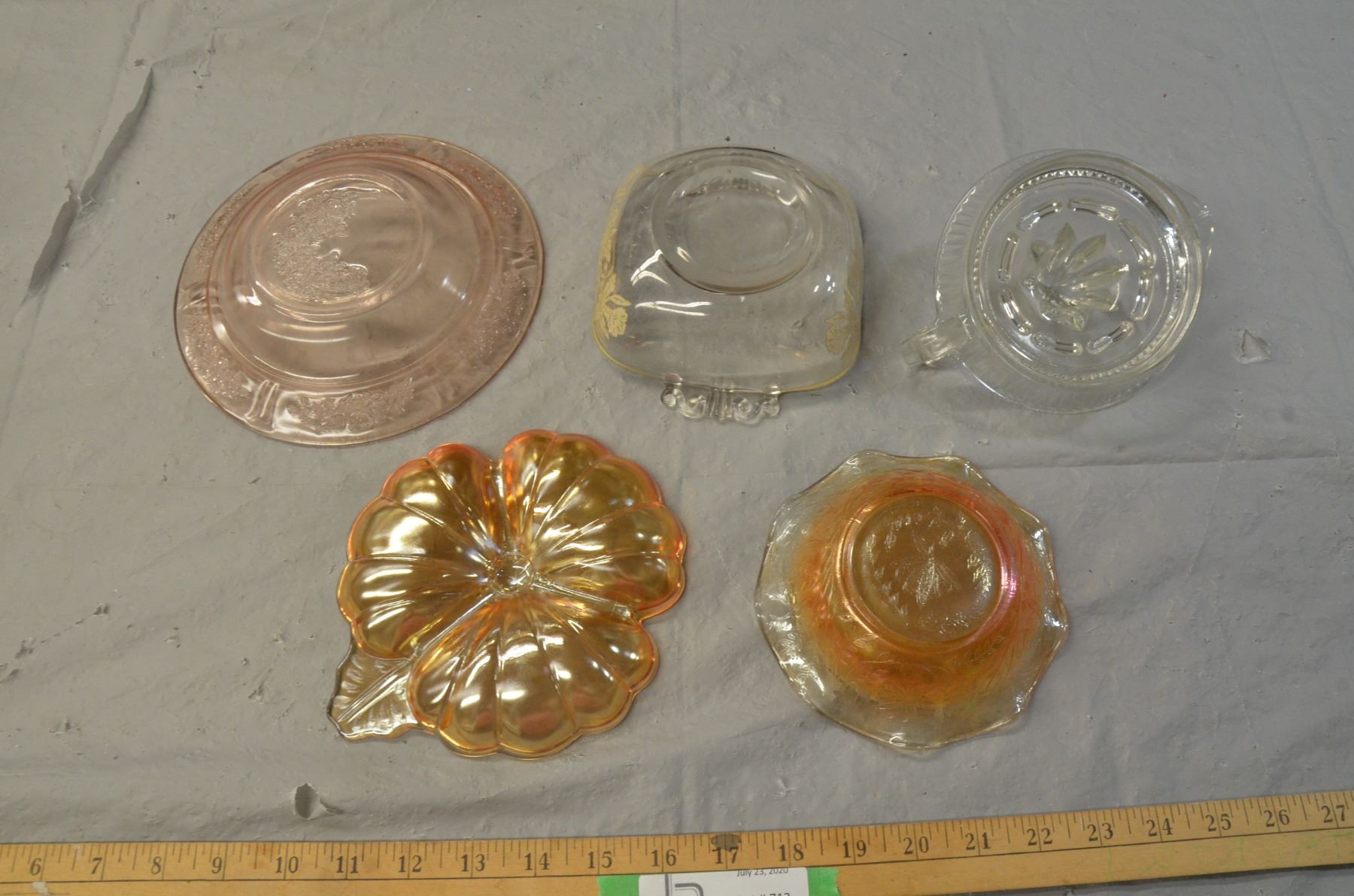 2 Yellow Carnival Glass Dishes and 3 Depression Glass Pieces