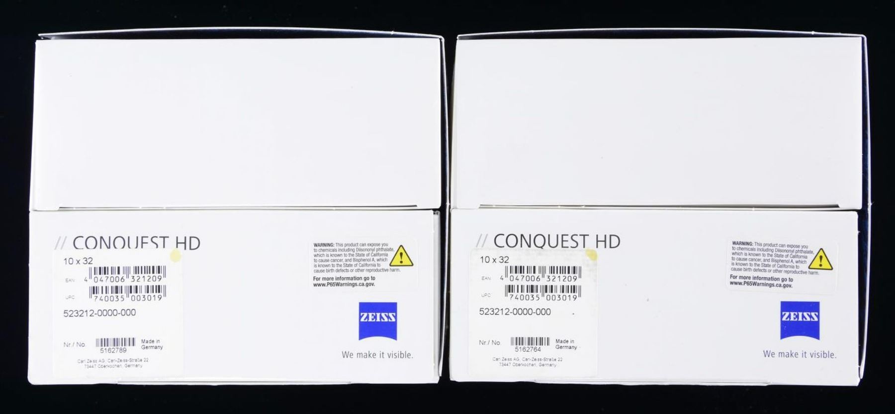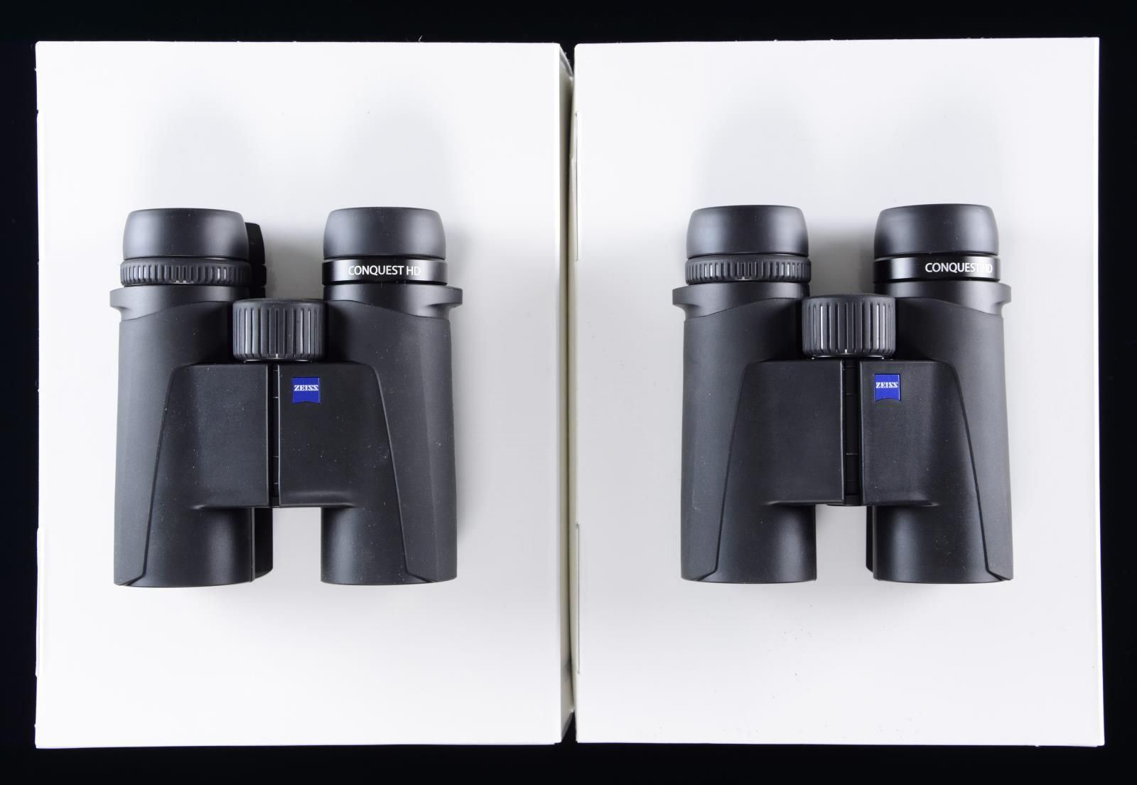 UPC: 740035003019. Each binoculars comes with box, carrying case & accessories. 1) S# 5162764. 2) S# 5162789. CONDITION: binoculars are near excellent. Boxes look very good to near excellent, with previous retailer stickers. PROVENANCE: the Collection of Gun Sport Ltd owned by Jon R. Thomas. (02-20728/MD). $850-1200.