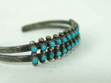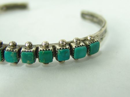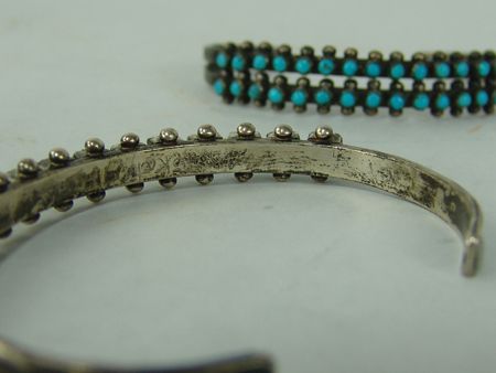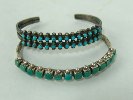 Mid 1900s, Both of turquoise and silver including a square-cut version by Agnes Bowekaty, and another vintage needlepoint row bracelet, unsigned. Both in very good condition with nice patina. Largest 5" + 1" x 1/2"