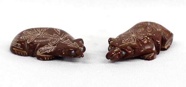Two Brand New 2018 Zuni Carved Soapstone Mom and Dad Badger Fetishes by Adrian Cachini, largest measures 1'' x 2.25'' and both are signed on the bottom, both have turquoise eyes and each has 2 inlay turquoise microdots on their backs, both have intricate etched designs on their backs, lots of work in these 2 fetishes