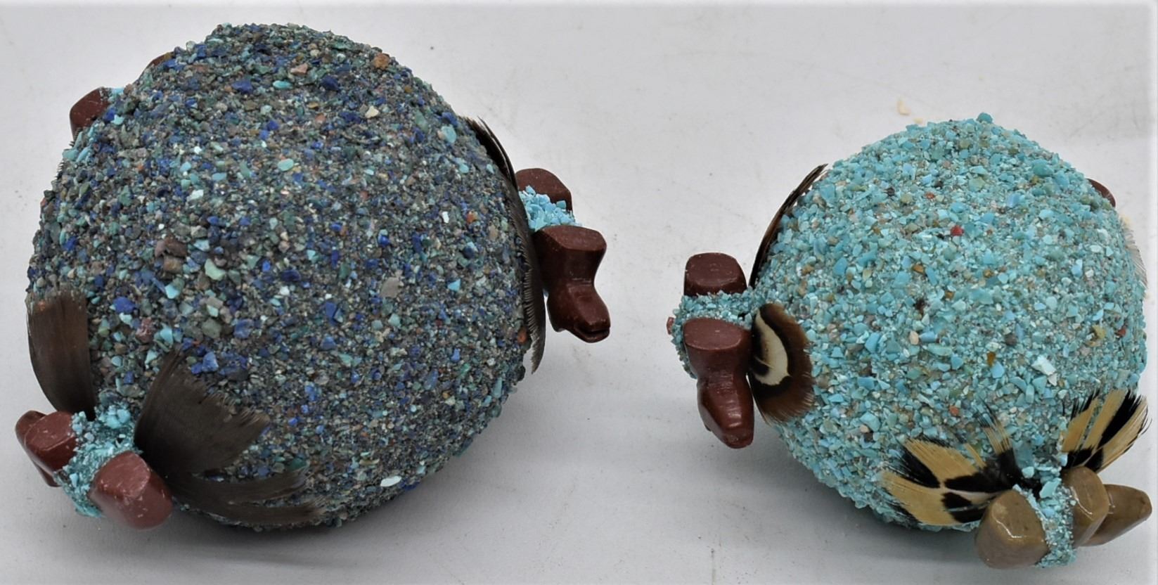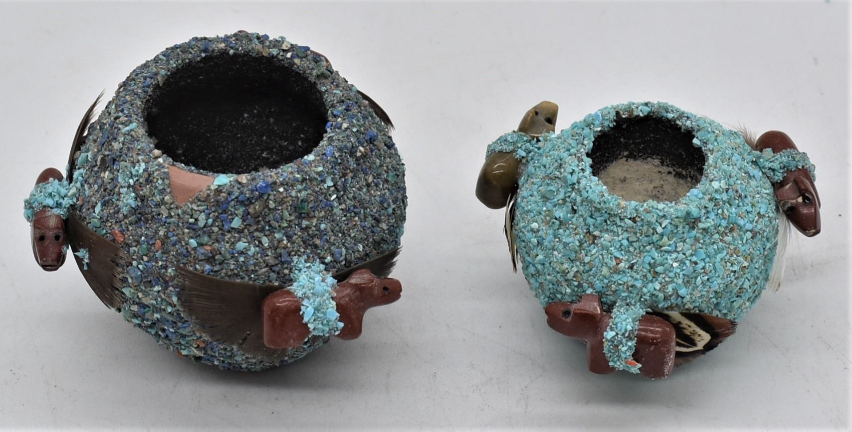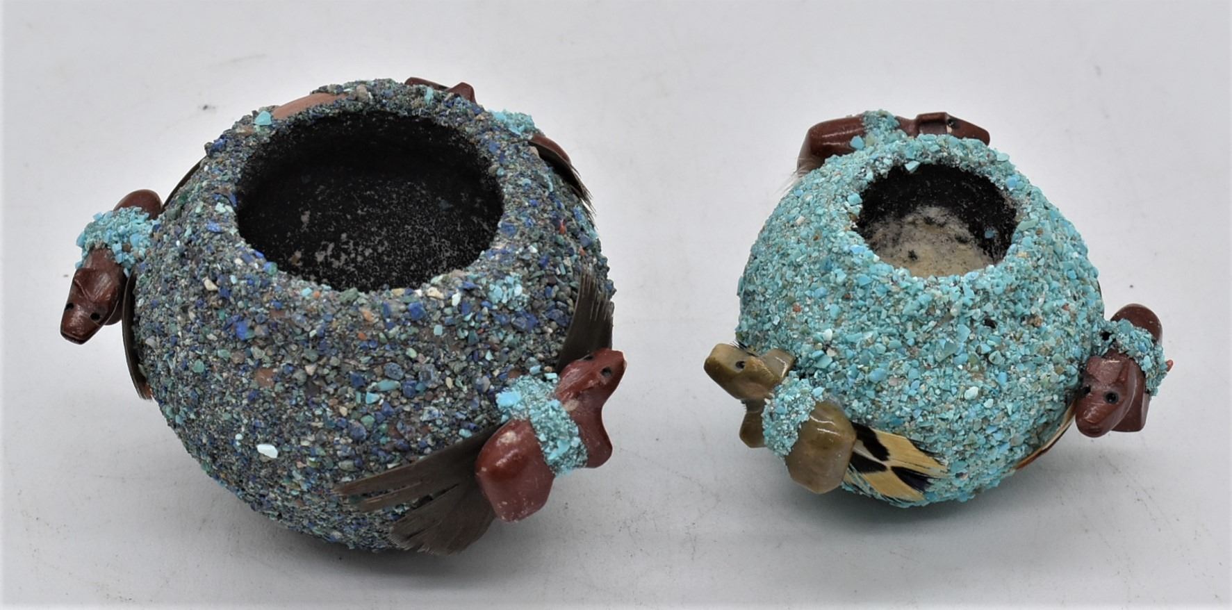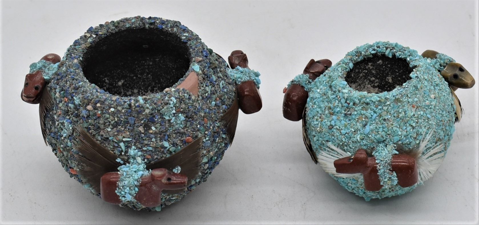 2 Native American Zuni Encrusted Turquoise Pottery Fetish Jars, largest measures 2.5''D x 2''H, largest is missing some turquoise chips, embellished with carved stone fetishes and feathers