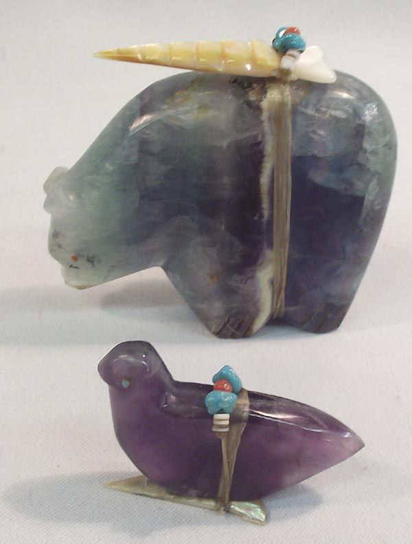 2 Native American Zuni Fetishes. Both with power packs on their backs. 1. Large Green quarts bear measures approx. 2 3/4''H x 3''L. 2. Amethyst bird fetish with.