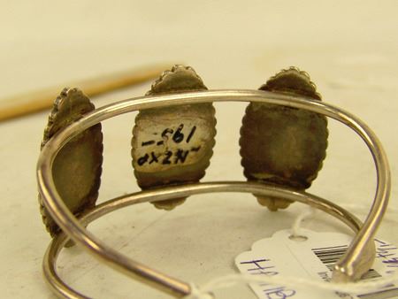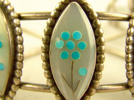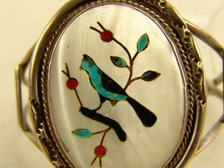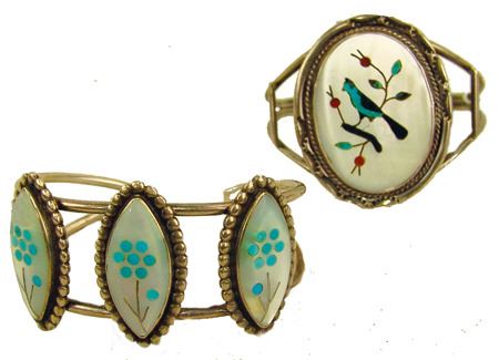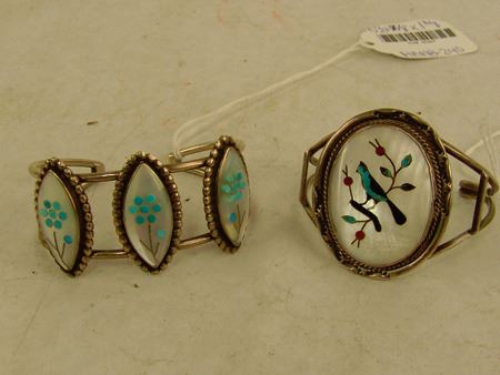 Ca. 1970s, Pair of 1970s all silver bracelets with mother of pearl inserts, one with a bird, the other with flowers. Very good condition. 5-1/2" + 7/8" x 1-3/8" 5" + 1-1/4" x 1-7/8"