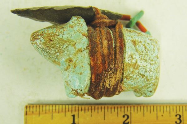 Pair of small, hand carved solid turquoise bear fetishs with arrowhead and trade bead bundle on their back. Very good condition.Mid 1900s2-1/2" x 1-3/4"