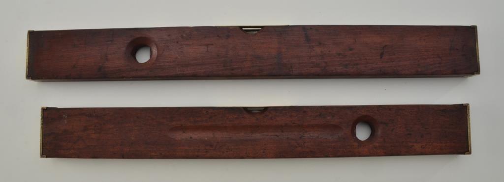 2 antique brass mounted on wood levels by Stanley with patent dates 6/23/96 on number 1 measuring 26 1/4” x 3 1/4” and similar level showing last patent date of July 2, 1872 of a slightly larger size measuring 28 ¼” in length. Both are in good condition and still working. Est.: $50-$150
