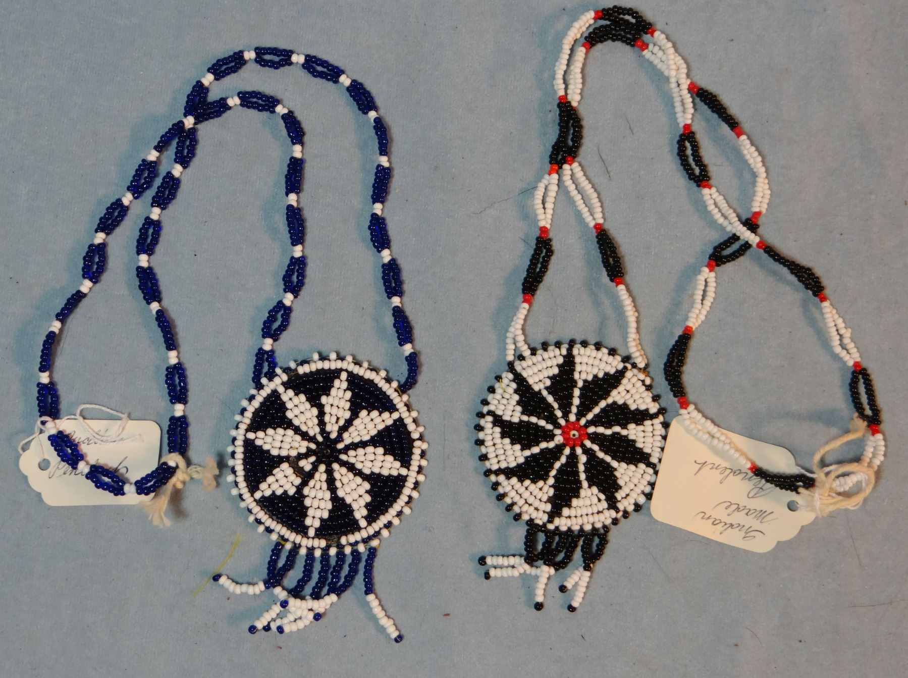 (2) beaded necklaces w/medallians, 1 w/ cobalt beads, 16" and 14"
