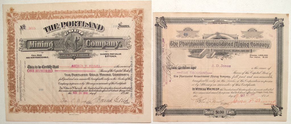 1) The Pharmacist Consolidated Mining Company. Stock #60 (very early) for 5,000 shares to A. D. Jones in 1899. Signed by James F. Burns and Charles Miller. Cancelled. Burns was something of a legend at Cripple Creek. He was a hero to the union for the stance he took in the 1903 strike. 2) The Portland Gold Mining Company. Stock #5615 for 100 shares to Arthur W. Butler in 1910. Signed by Frank Peck and James F. Burns. The Portland Company's property was located adjacent to the Independence on Battle Mountain.