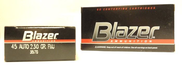 2 boxes of CCI Blazer .45 ACP ammo. 230 grain. 50 rounds per box. EST $55-$70