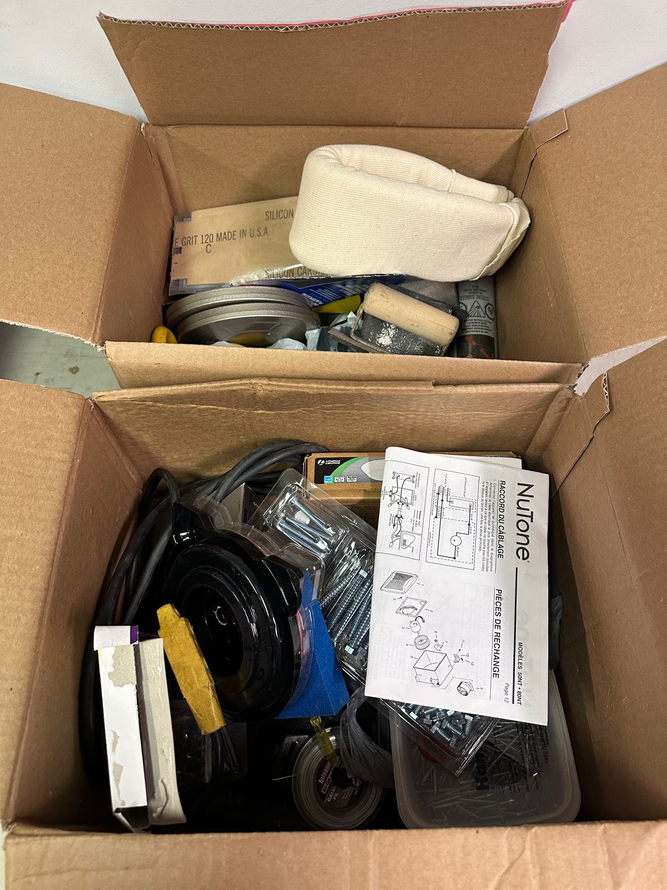 2 boxes full of assorted tools related items - includes 7" LED versa lite flush mount / work lights / screws / roof & flashing sealants etc