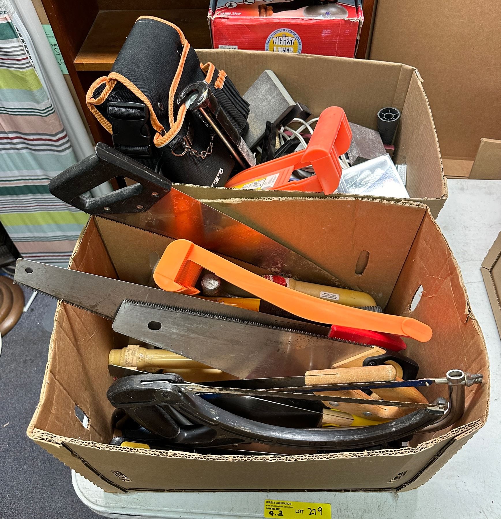 2 boxes full of assorted tools & tool related items - includes hand saws / hammers / panel carry / wall drillers etc