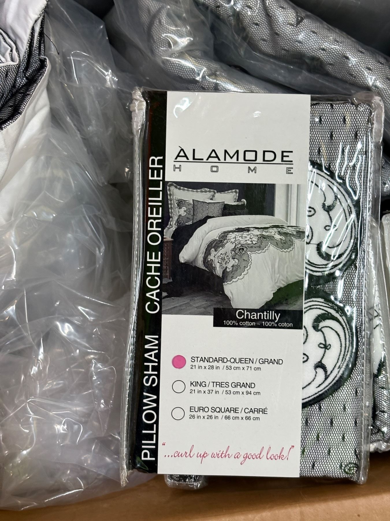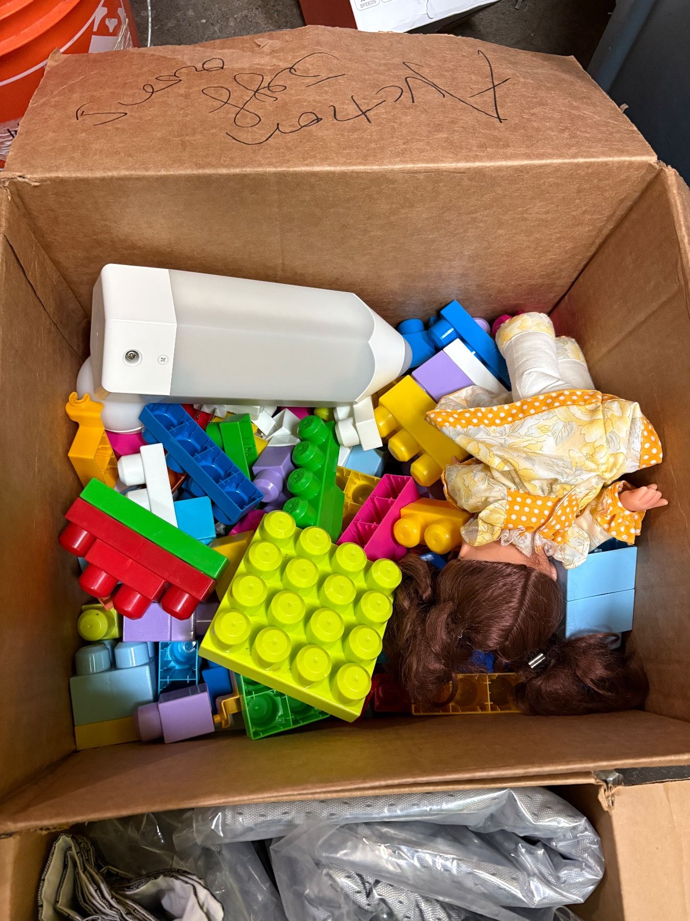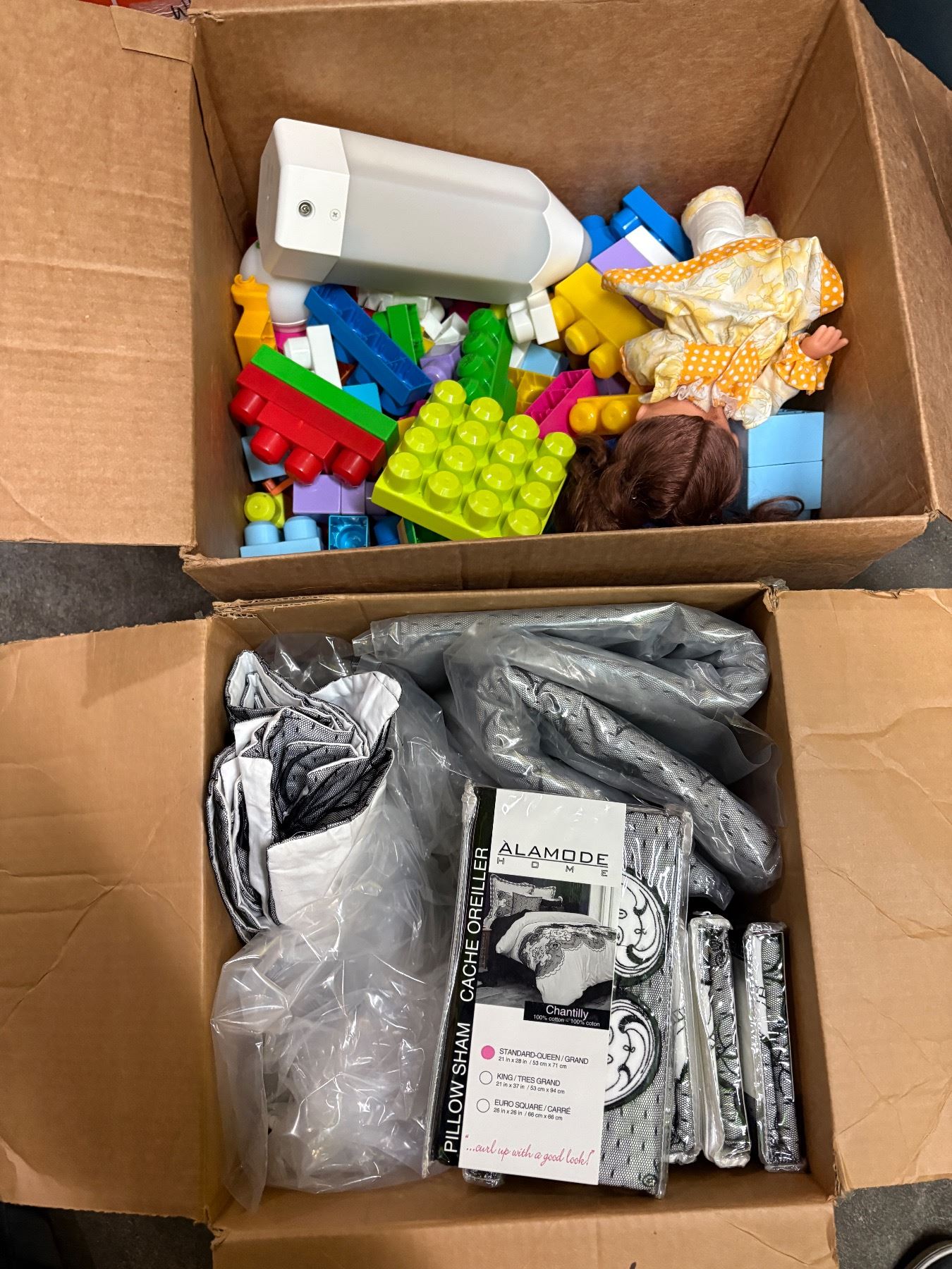 2 boxes with assorted standard queen pillow shamps & assorted building block toys