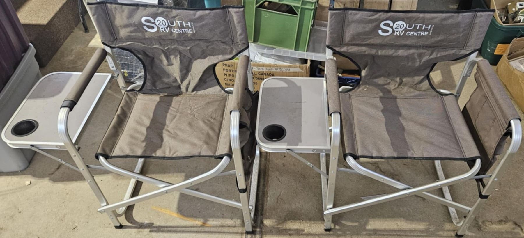 2 camping folding director chairs with table w/ cupholder and 4 pockets on the left side 2 velcrow, 1 open and 1 zipper