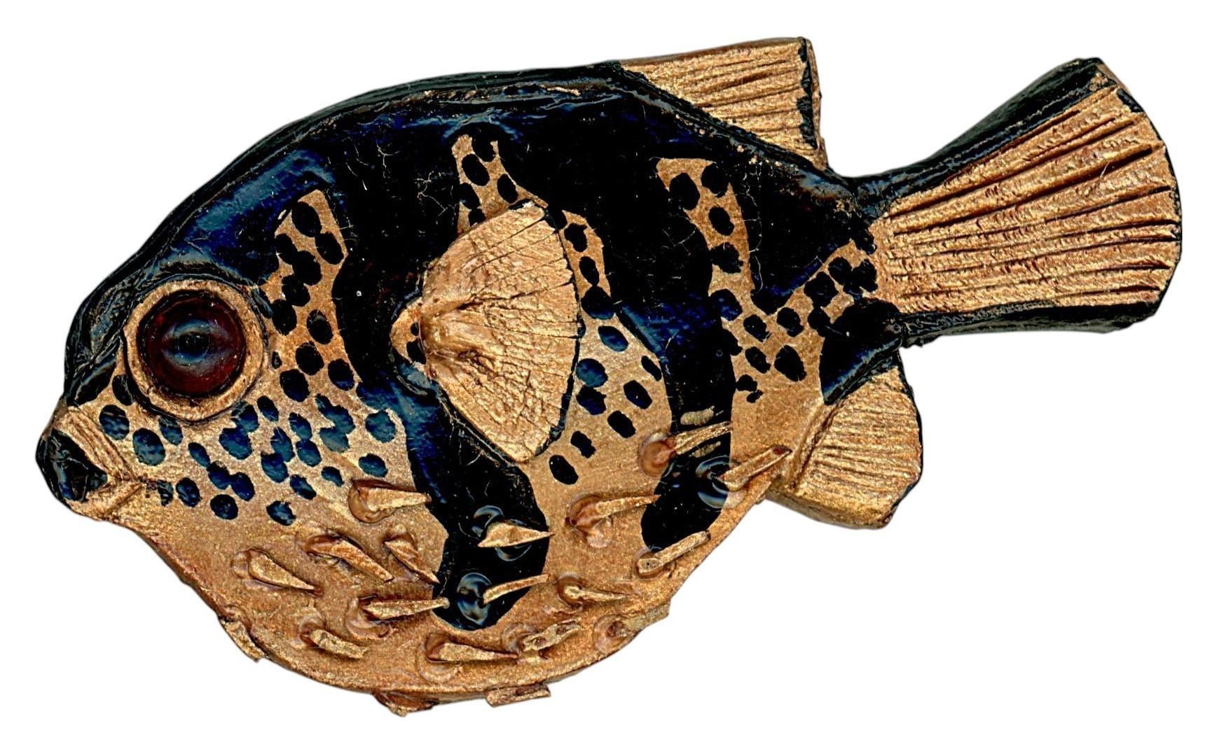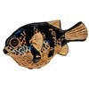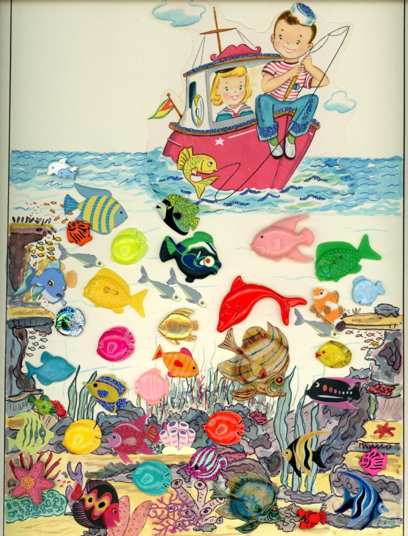 24 PLUS S/M/L 20th century assorted material examples. Here is a very cute card compiled by Jose Roman with many nice fish buttons in an assortement of materials including glass, celluloid, coconut shell, plastic, wood and more. Take a look at the absolutely beautiful wood laminated example )image attached) the design and colors are marvelous. Lots of cool fish here. As a bonus we includes an second adorably decorated card of fish buttons for fun.
