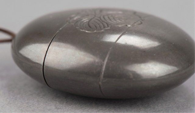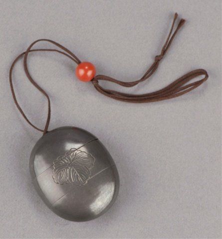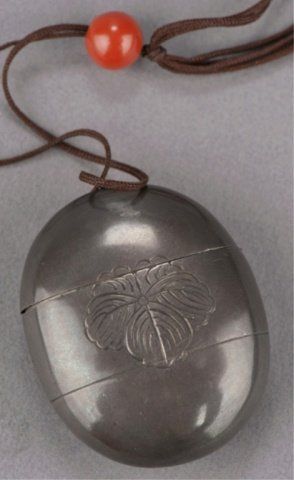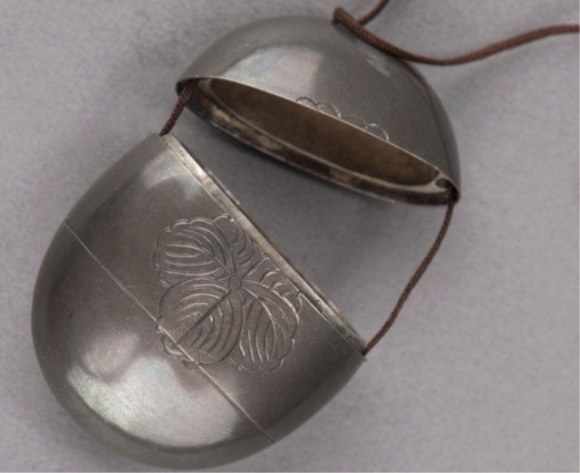 A small two-case inro in silver. 3rd quarter 19th century. Engraved on one side with a kiri-mon (a Paulownia leaf crest). 1 3/8" x 1 1/8". The Helen & Jack Mang Collection Yagi (H.) Kyoto, Japan